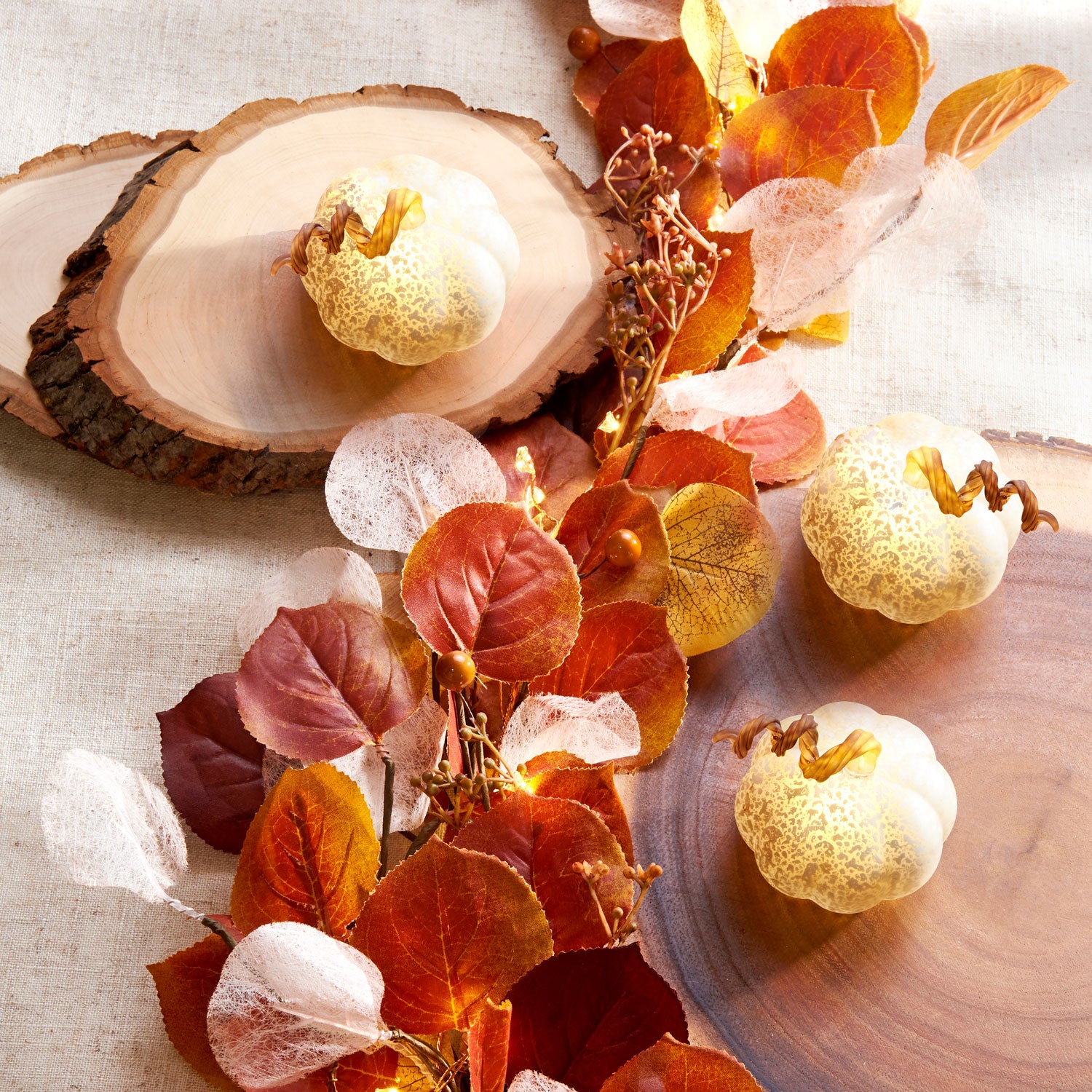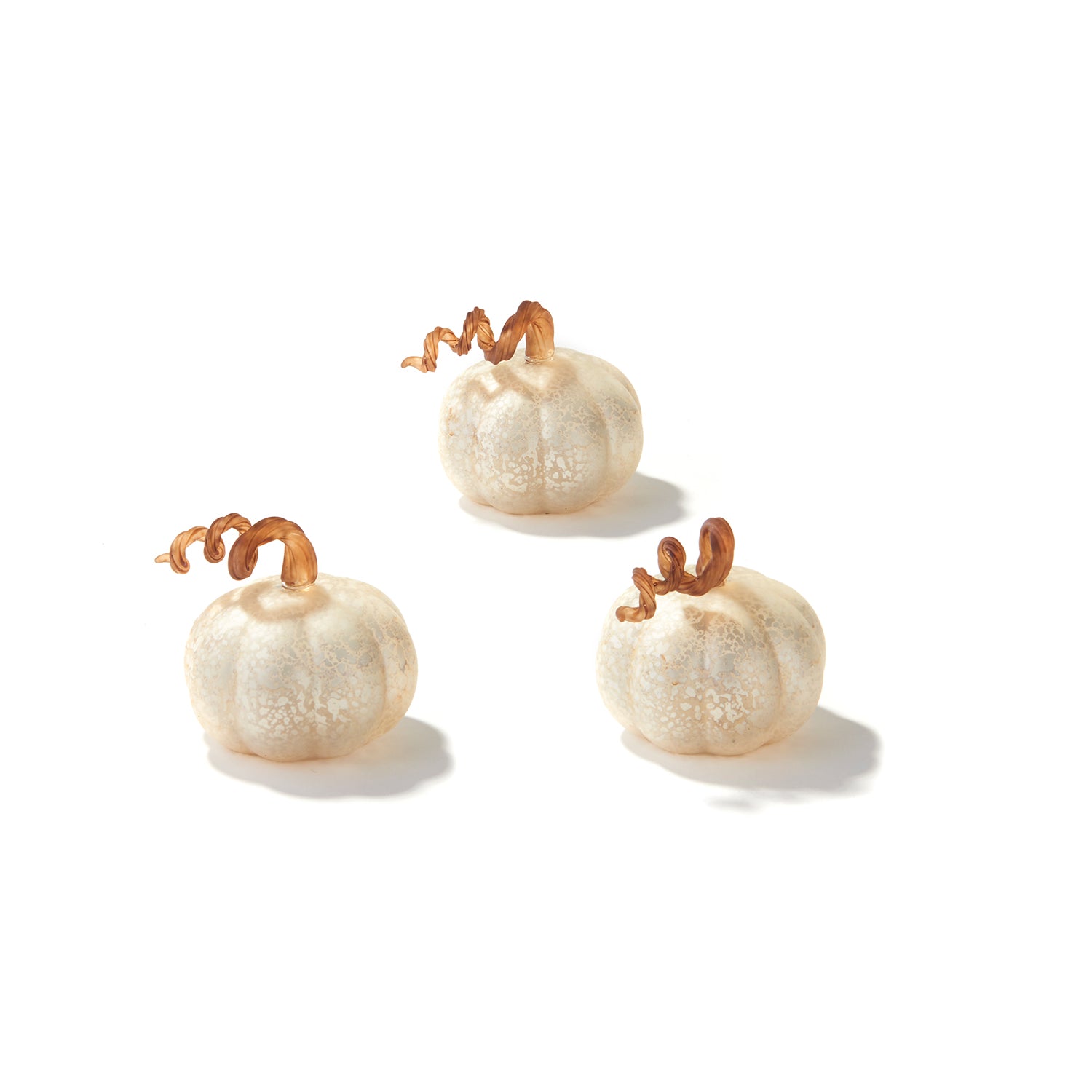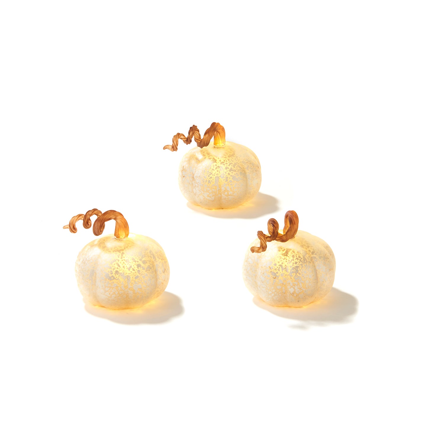 • Set of three white mini glass pumpkins, lit with a warm white LED and crowned with cute brown swirling stems
