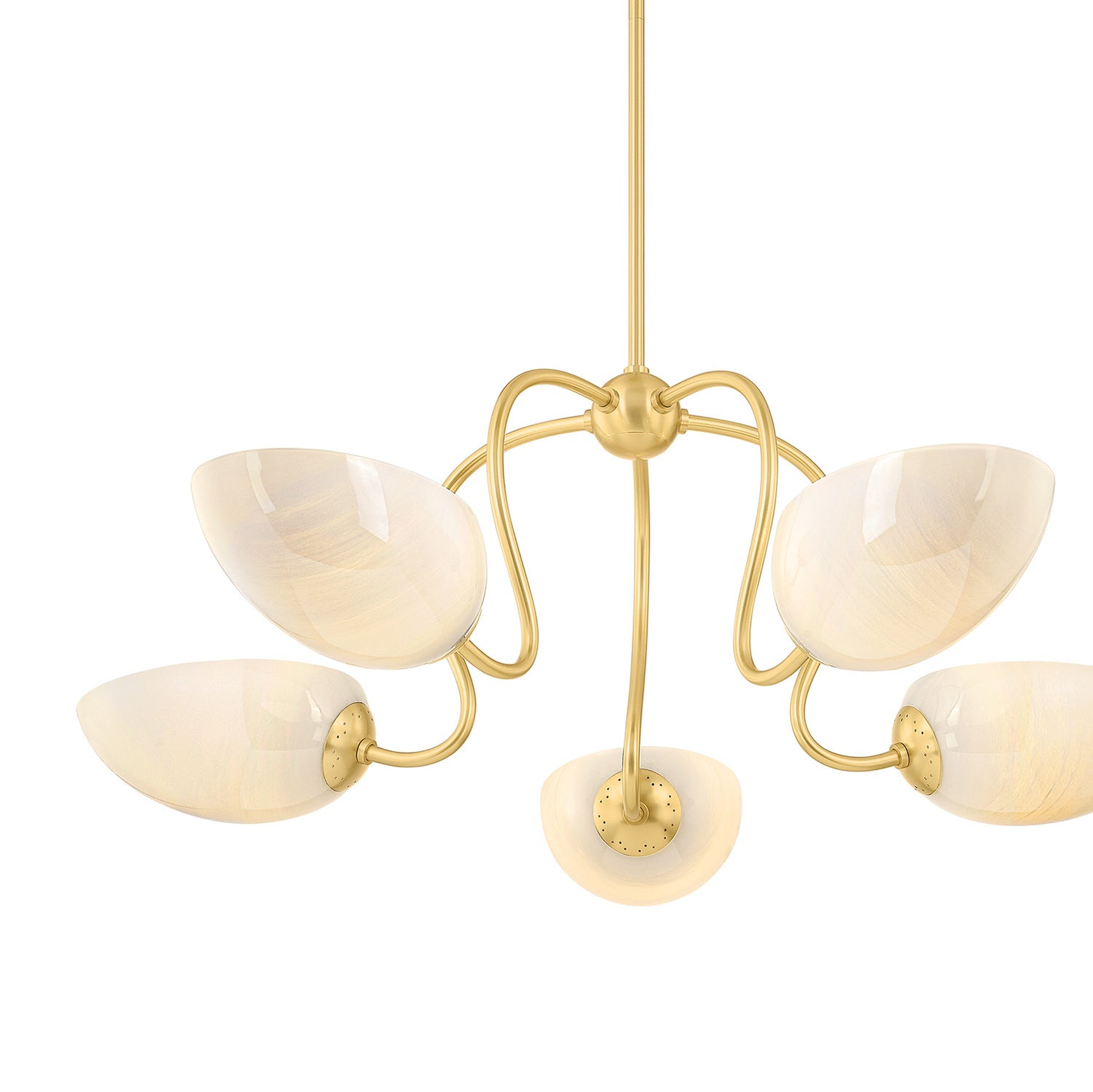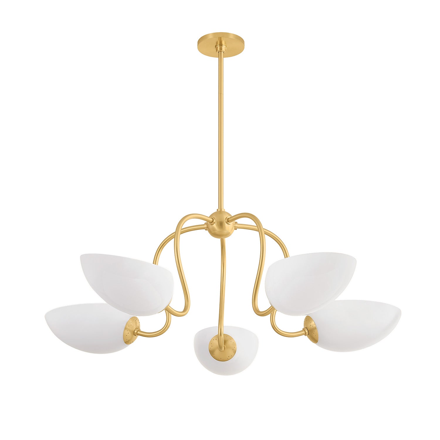 The Calliope 5 Light Chandelier is a modern statement chandelier that makes a sophisticated impression with its playful, organic form and dynamic scale. The fixture features five curved metal arms that cradle smooth Cloud Glass shades, providing broad, soft, and inviting illumination. This mid-century-inspired chandelier is thoughtfully designed as an eye-catching centerpiece for a dining room or large living space. With its UL damp rating, it offers both functional beauty and versatile appeal. The rich Aged Brass finish enhances the sculptural, multi-light design, delivering enduring style and a perfect blend of elegance and simplicity.