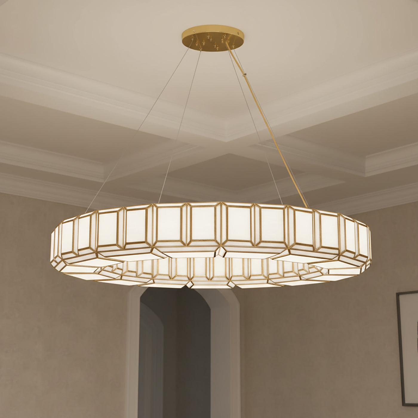 The Camille 16 Light Chandelier brings refined sophistication to any space with its striking design and warm antique brass finish. This captivating round chandelier features hand-cut white glass pieces arranged in emerald shapes and individually trimmed in antique brass, creating magnificent, evenly distributed illumination that transforms dining rooms, entryways, and living spaces into stunning showcases. The intricate brass-framed glass elements deliver unique flashes of light and reflection through their many individual cuts and surfaces. At an impressive 48" in diameter with its distinctive round design, this chandelier makes an unforgettable centerpiece.