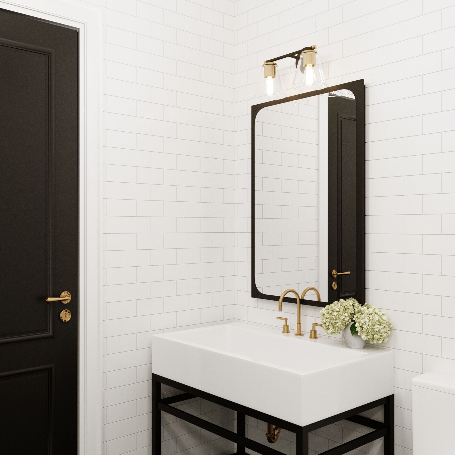 Inspired by industrial design with some glam and art-deco undertones, the Carlisle 2-Light Vanity Wall Light is a modern spin on a traditional silhouette. Featuring two clear tapered glass shades accented with brass sockets, suspended by a bar in a matte black finish, the fixture will look clean and sleek in any space. The contrasting details create interest and drama in the classically styled fixture. Use this beautiful vanity to create ambient, yet direct light above a mirror or sink, or install above an entryway table or workspace. Install a dimmer and enjoy a truly customizable lighting experience.