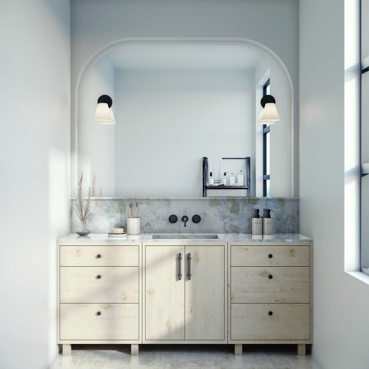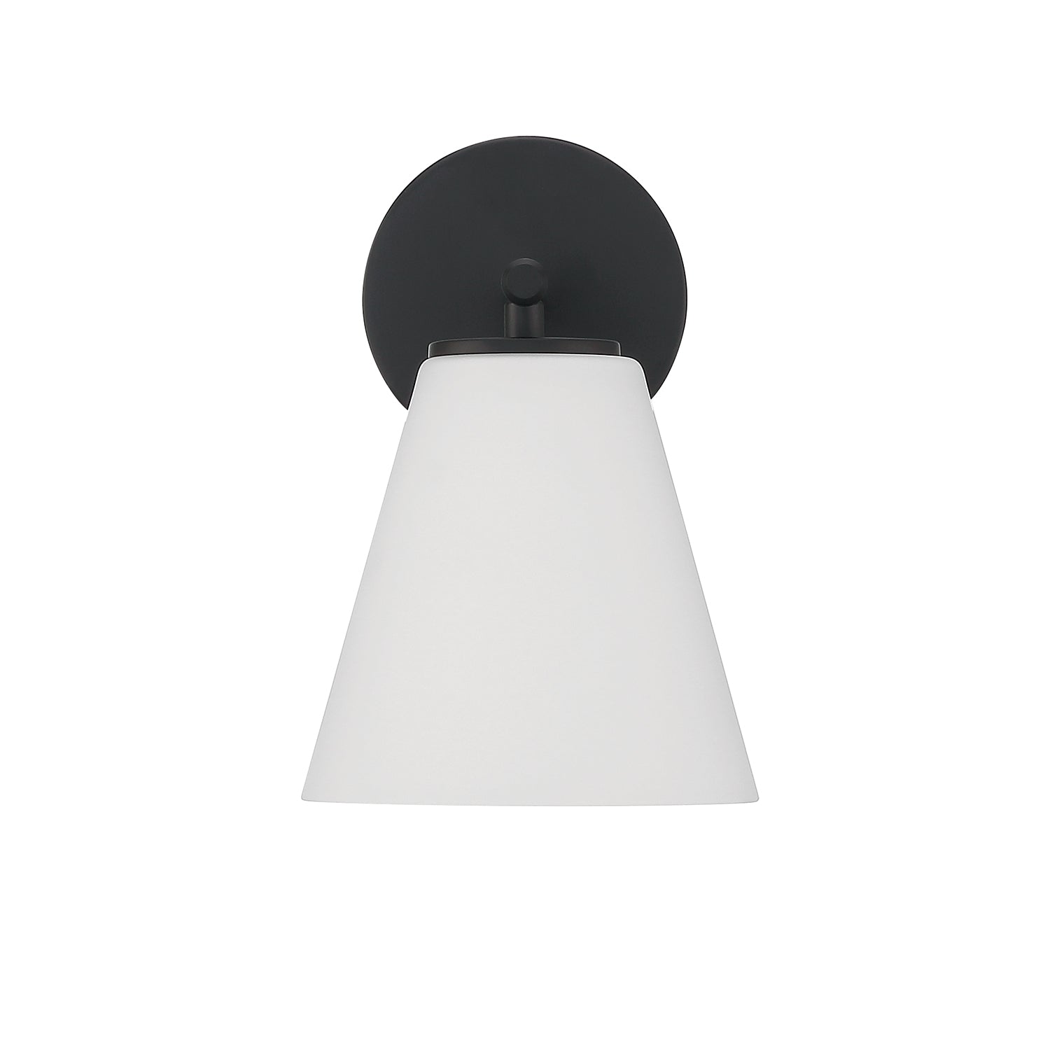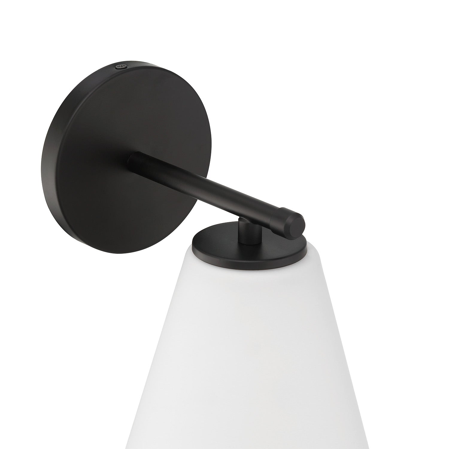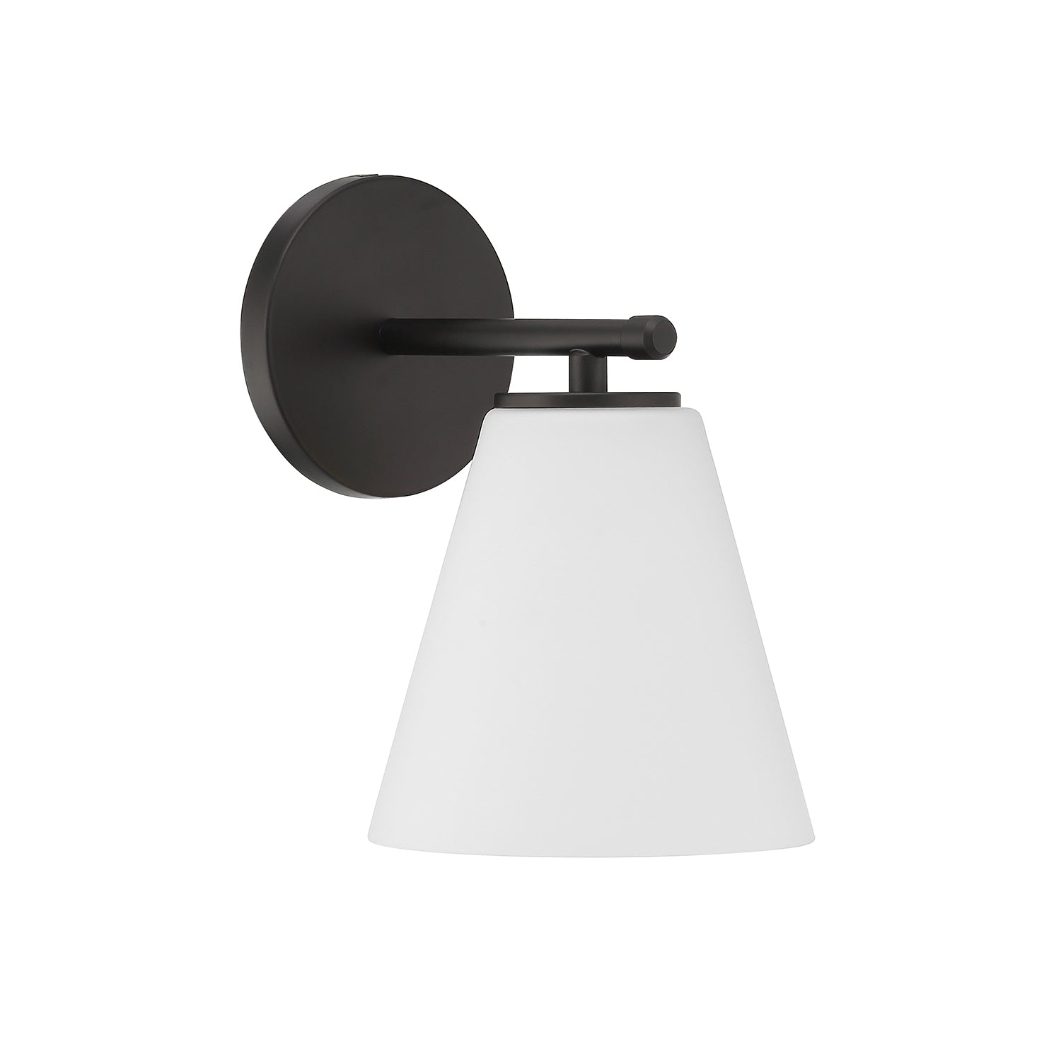 Inspired by industrial design and art-deco undertones, the Carlisle Vanity Wall Sconce is a modern spin on a traditional silhouette. Featuring a tapered opal glass shade suspended by a matte black bar and backplate, this fixture will look clean and sleek in your space. Whether arranged as a single piece or in multiples, the contrasting glass and finish create interest and drama in the classically styled fixture.