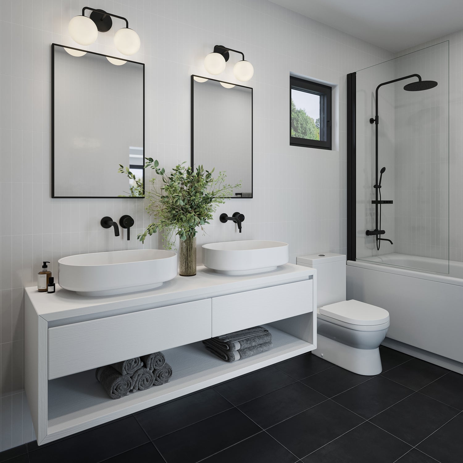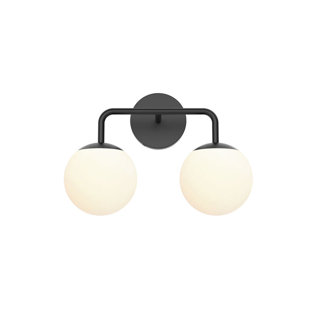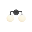 The Castell 2 Globe Vanity Light is a contemporary spin on a mid-century modern classic. Features two frosted glass globes crowned with a spun-metal cap and suspended by elegant, curved arms - all in a modern, dramatic matte black finish. Ideal in pairs; add ambient, yet direct light in a powder room or bathroom above a mirror.