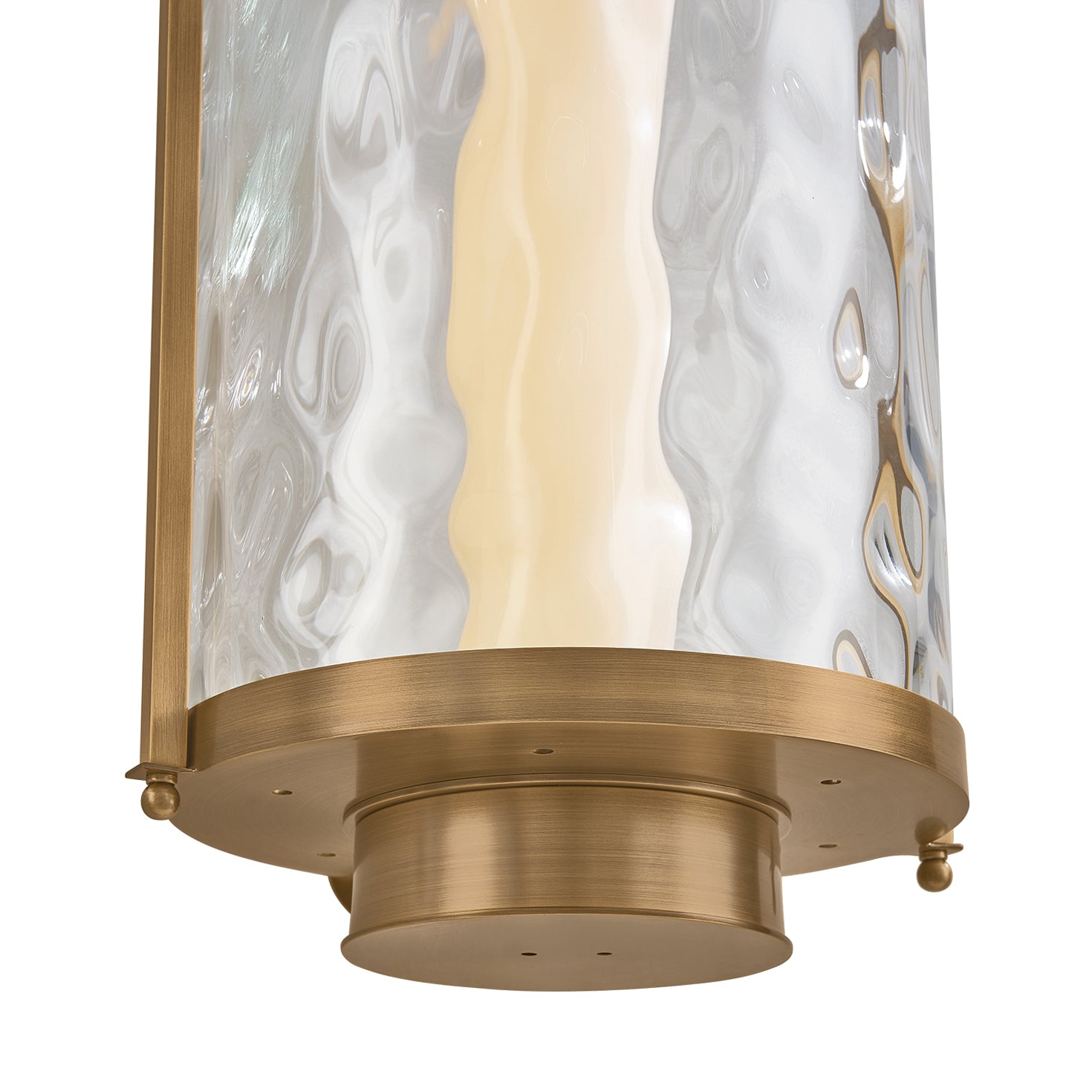 • Catalina LED Outdoor Wall Light features a patina brass frame with clear water glass cylindrical shade and central LED light bar for a contemporary aesthetic