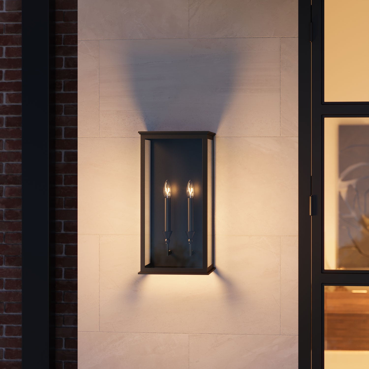 The Clinton Outdoor Wall Light brings timeless elegance to exterior spaces with its classic lantern design. This fixture features a streamlined rectangular silhouette in a textured, vintage bronze with clear glass panels on all sides. The transparent glass showcases candle-style light sources, creating a warm, inviting glow that enhances your home's architecture. With its proportional design, it provides excellent illumination for medium-sized spaces. The Clinton delivers sophisticated lighting that complements various architectural styles from colonial to transitional, enhancing your home's curb appeal while providing welcoming illumination.