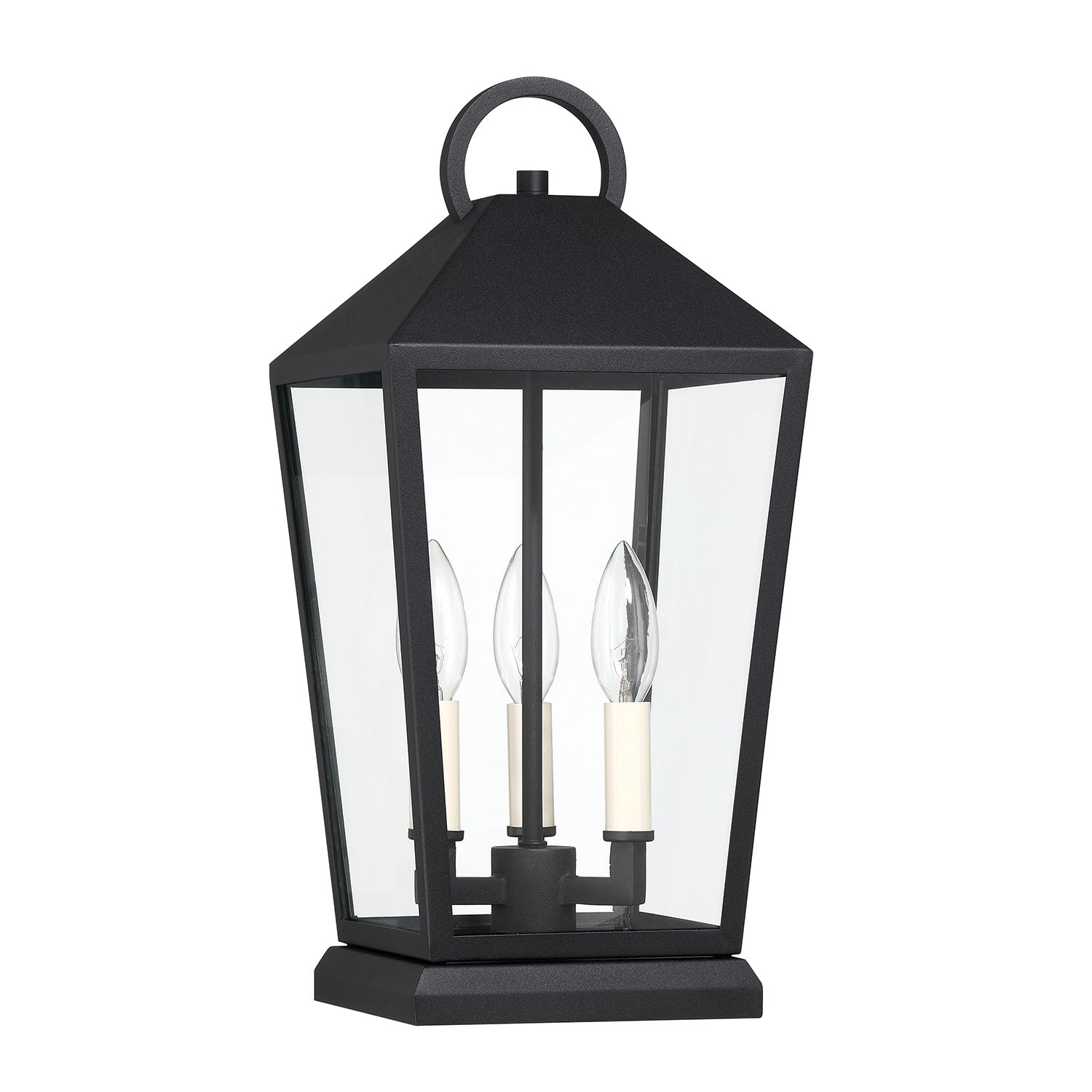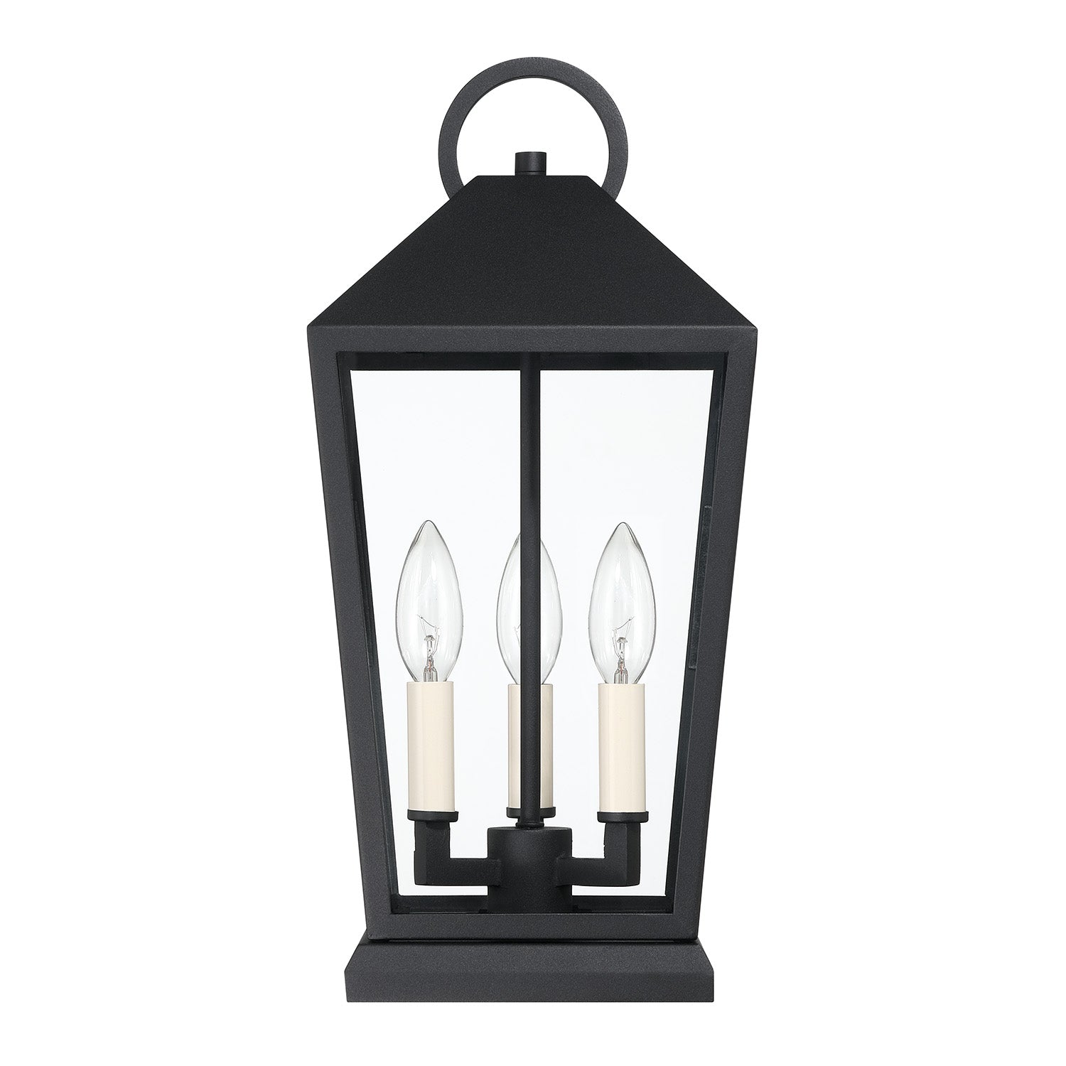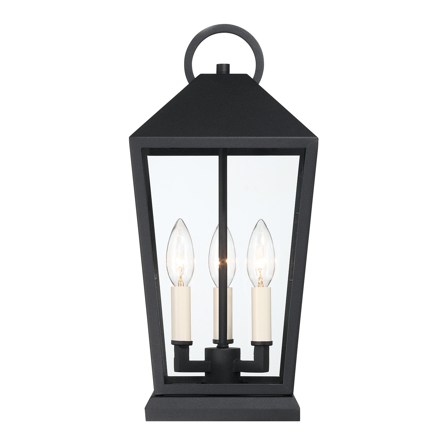 • Outdoor 17.5" pier mounted light features three candelabra bulbs set in a classic lantern style metal and glass fixture and finished in matte black