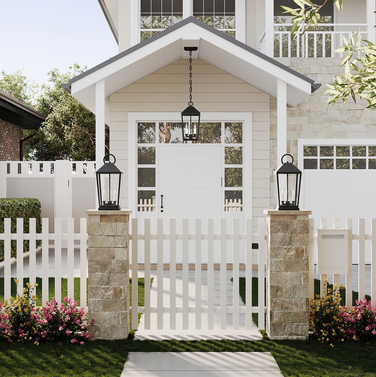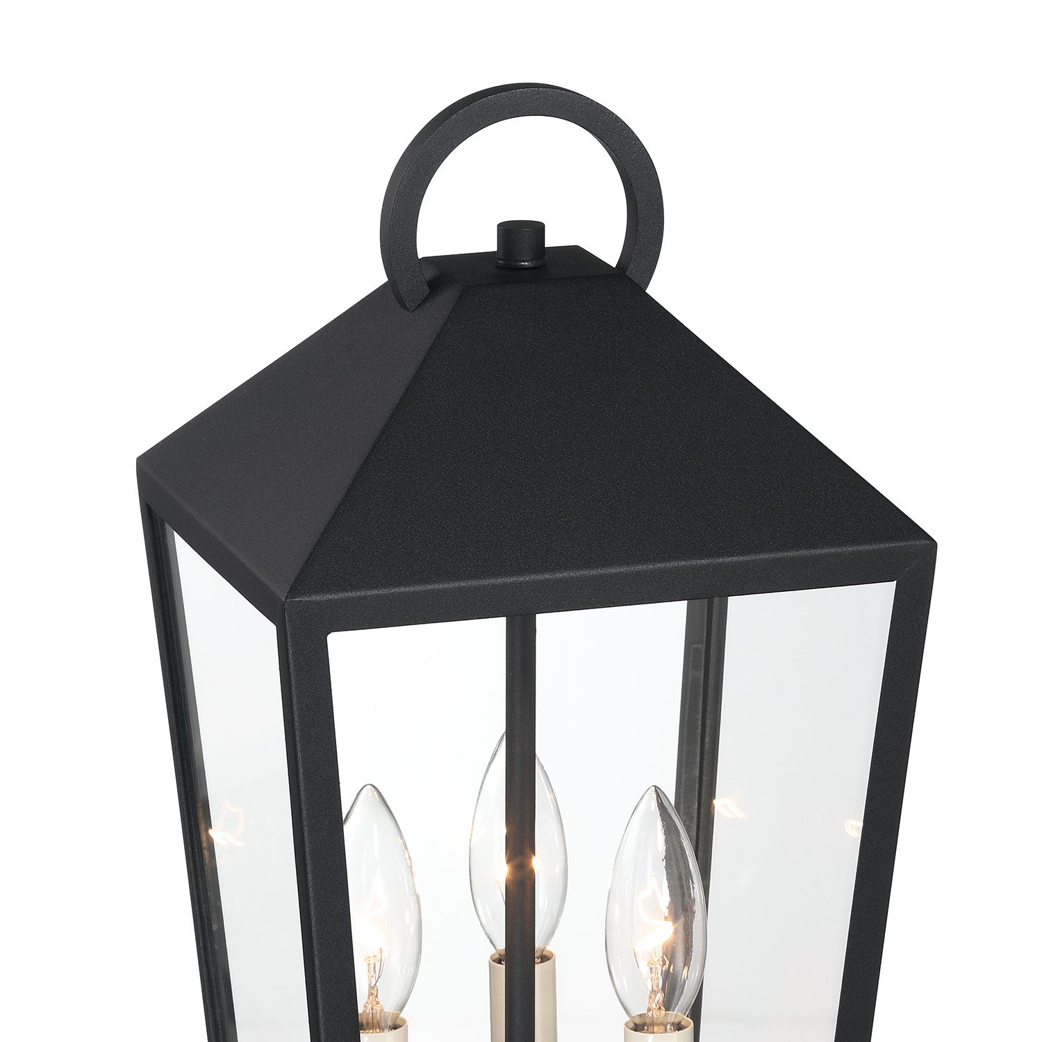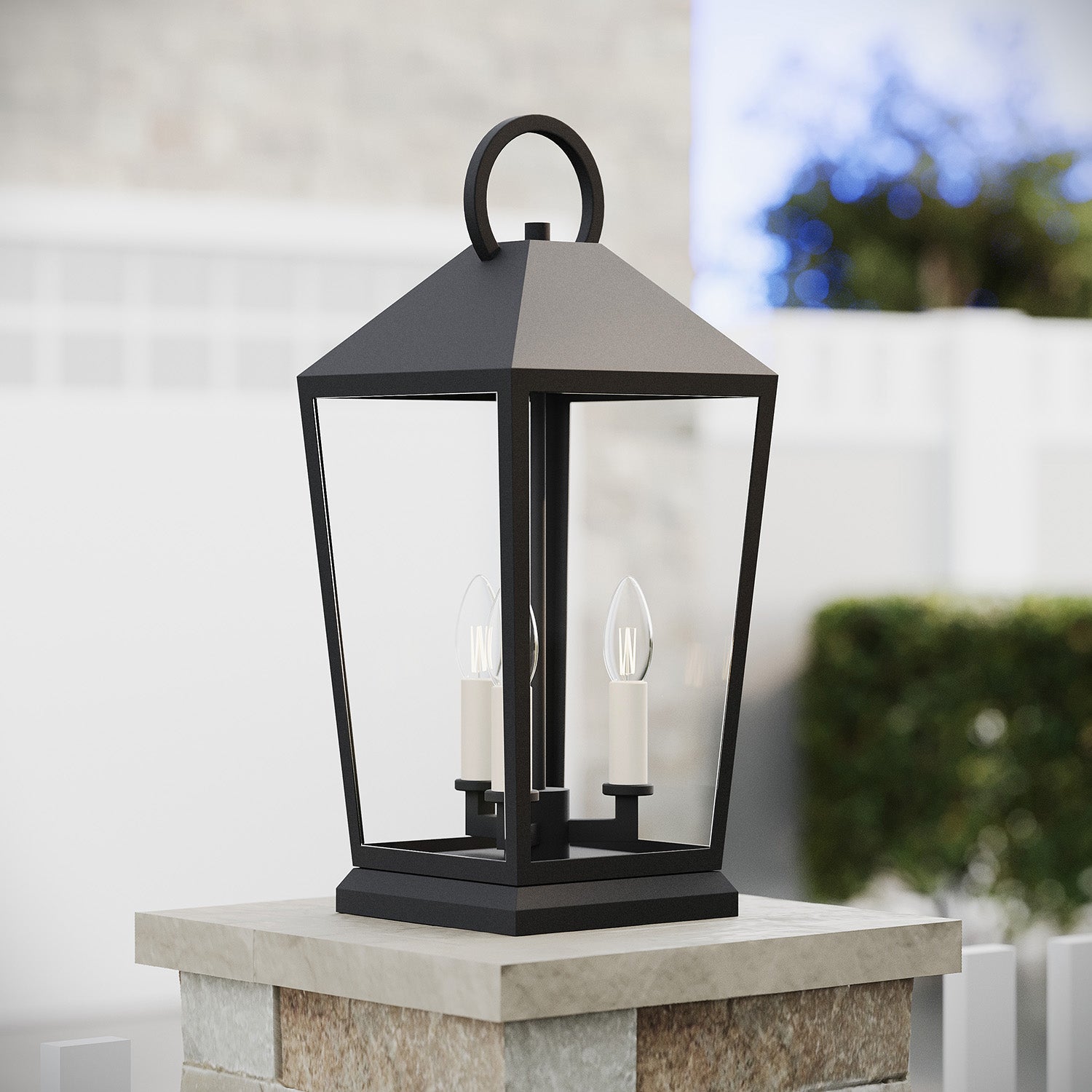 • Outdoor 17.5" pier mounted light features three candelabra bulbs set in a classic lantern style metal and glass fixture and finished in matte black