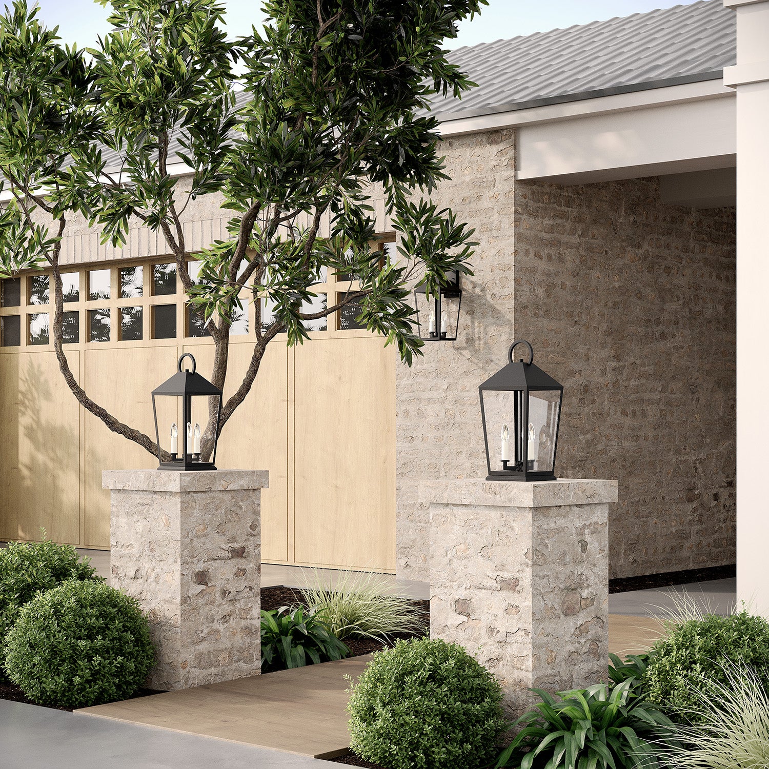 The Cole Outdoor Pier Mount Light is a timeless and classic lantern design with a modern sensibility. A slightly tapered silhouette reveals simple lines that seamlessly frame clear glass side panels and three candelabra bulbs, housed in cream-colored sleeves. This 17.5" tall outdoor pier light is designed to withstand the elements complete with a matte black, powder-coated finish, and is wet-rated. Perfect for illuminating an entryway, lighting a patio, or in pairs flanking an entry gate, this handsome fixture is part of the larger Cole Outdoor Lighting collection, including post, wall, and hanging lights to complete your exterior lighting project.