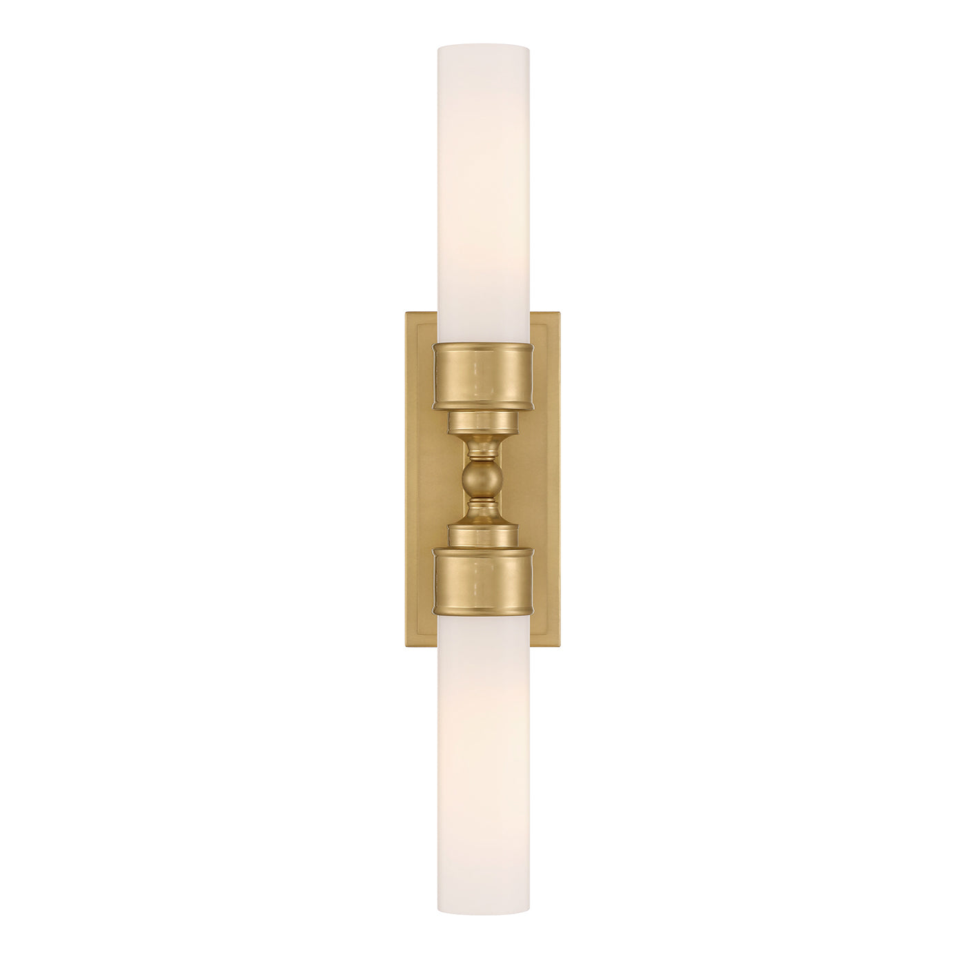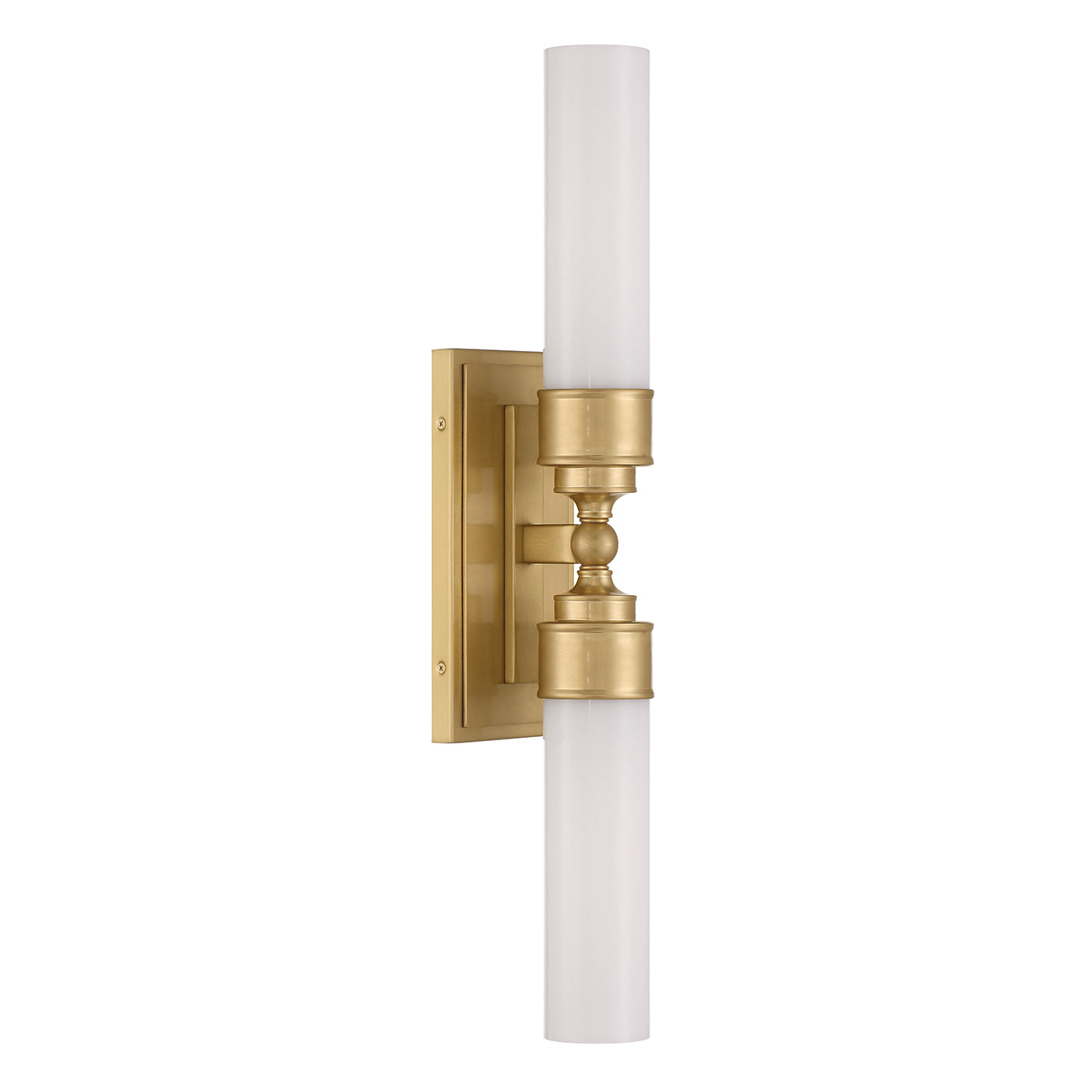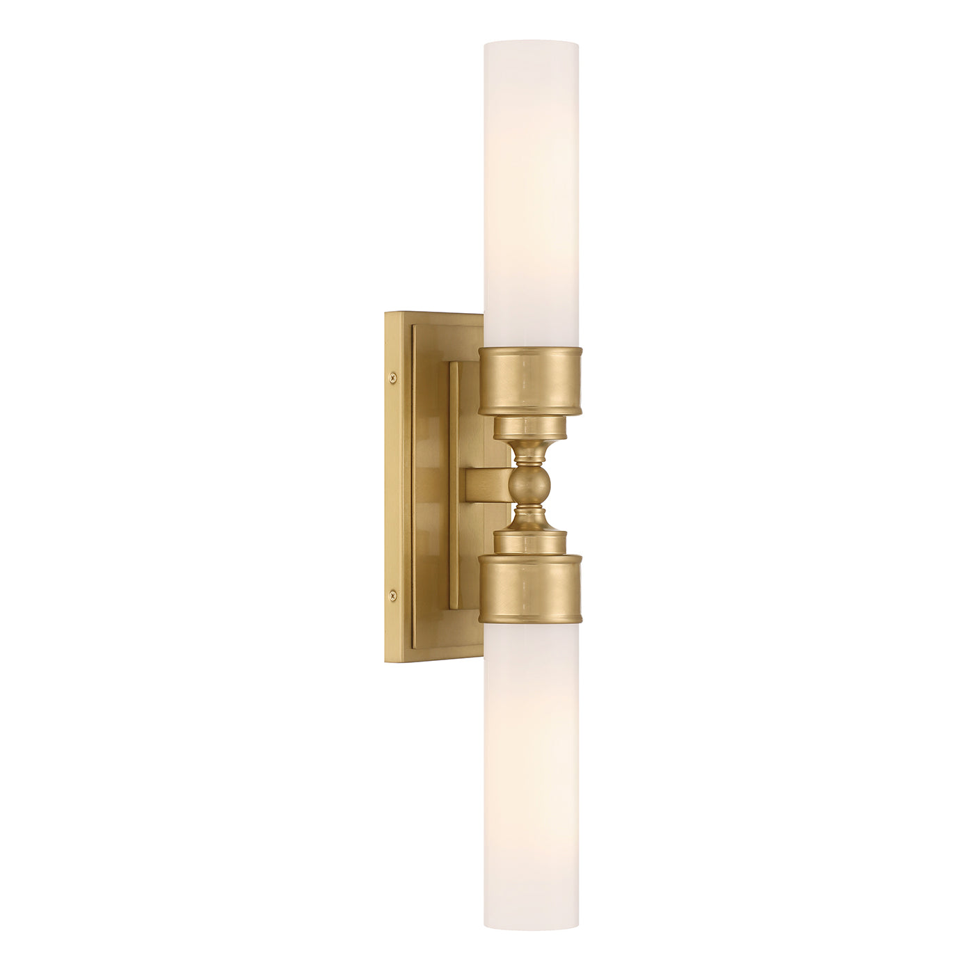 • Elegant wall sconce featuring dual 10.25" opal glass cylinders with warm aged brass accents for a sophisticated, timeless look