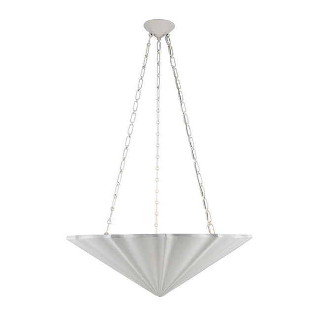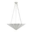 The Cora Pendant showcases a timeless design inspired by the traditional cast plaster lighting of the 1930s and 40s. This elegant ceiling light features a sculptural form with wave-like carvings that create an organic, textural pattern throughout its surface. The distinctive silhouette makes a statement in any space, functioning as both a light source and a hanging sculpture. Suspended by decorative chains from a matching canopy, Cora's textured white plaster finish brings a touch of refined elegance to any interior. With its impressive 30" diameter and four-light design, this chandelier makes a striking focal point in entryways, dining rooms, or living spaces, adding artisanal character and a soft, ambient glow.