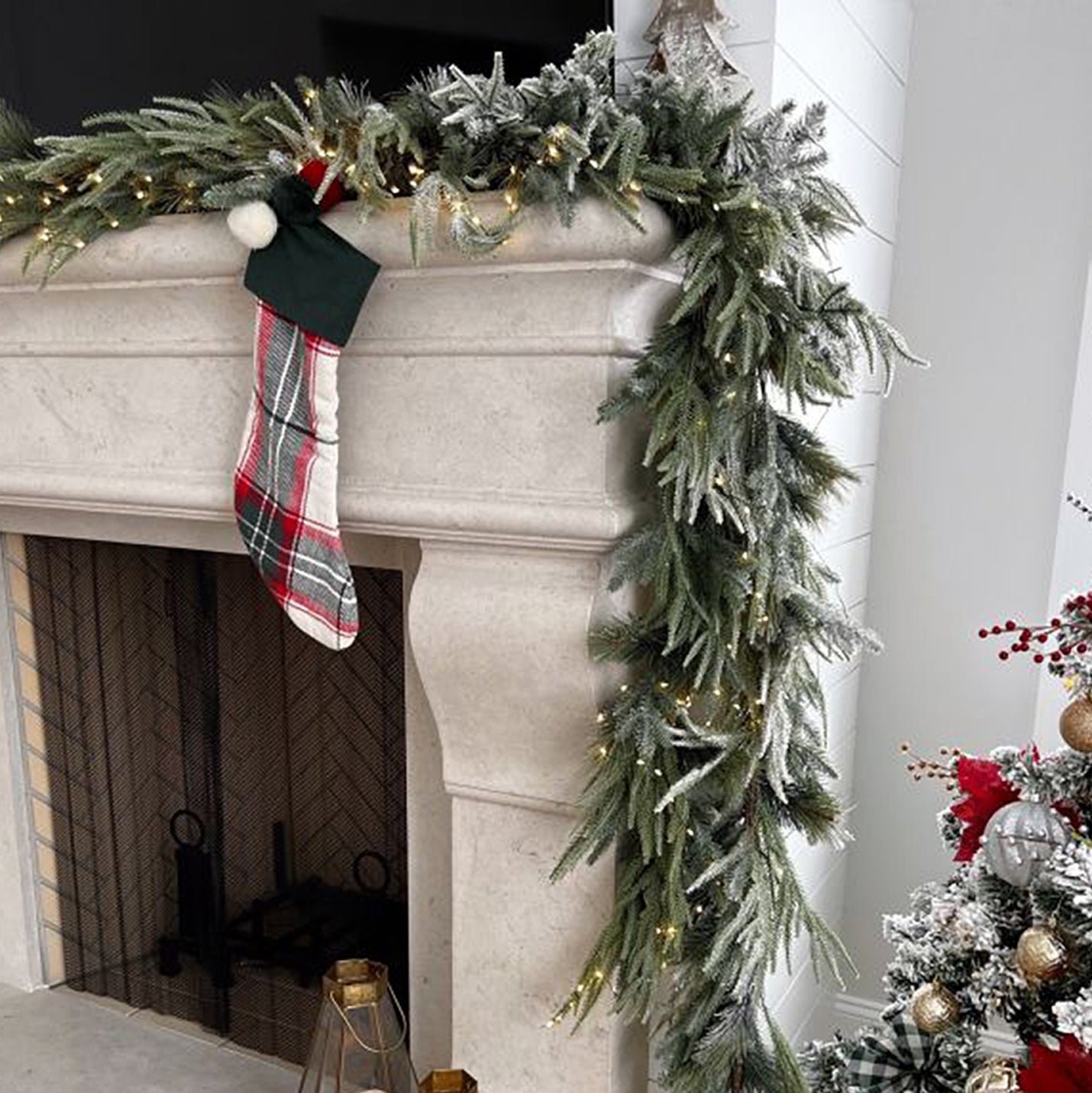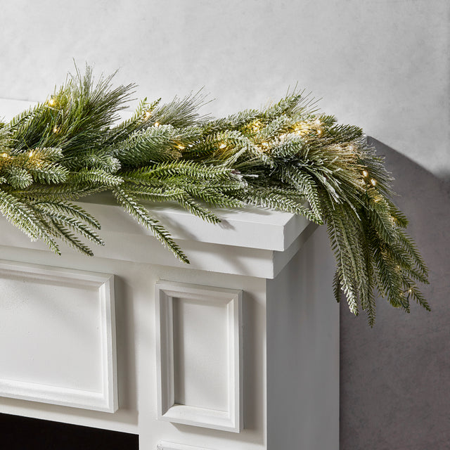• One six-foot garland of lush pine and spruce, dusted with faux snow, and pre-lit with warm LED fairy lights