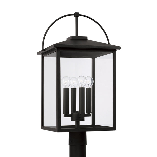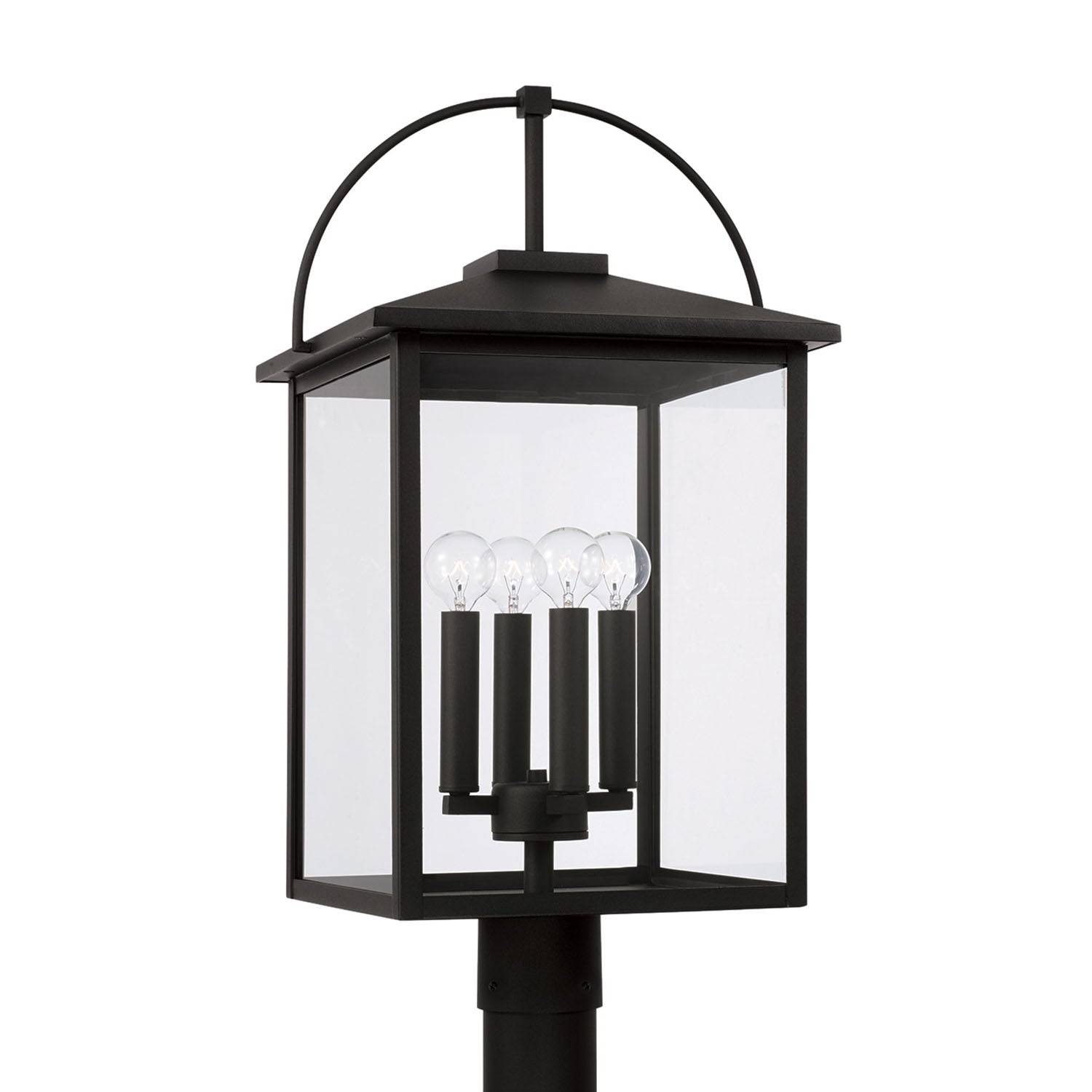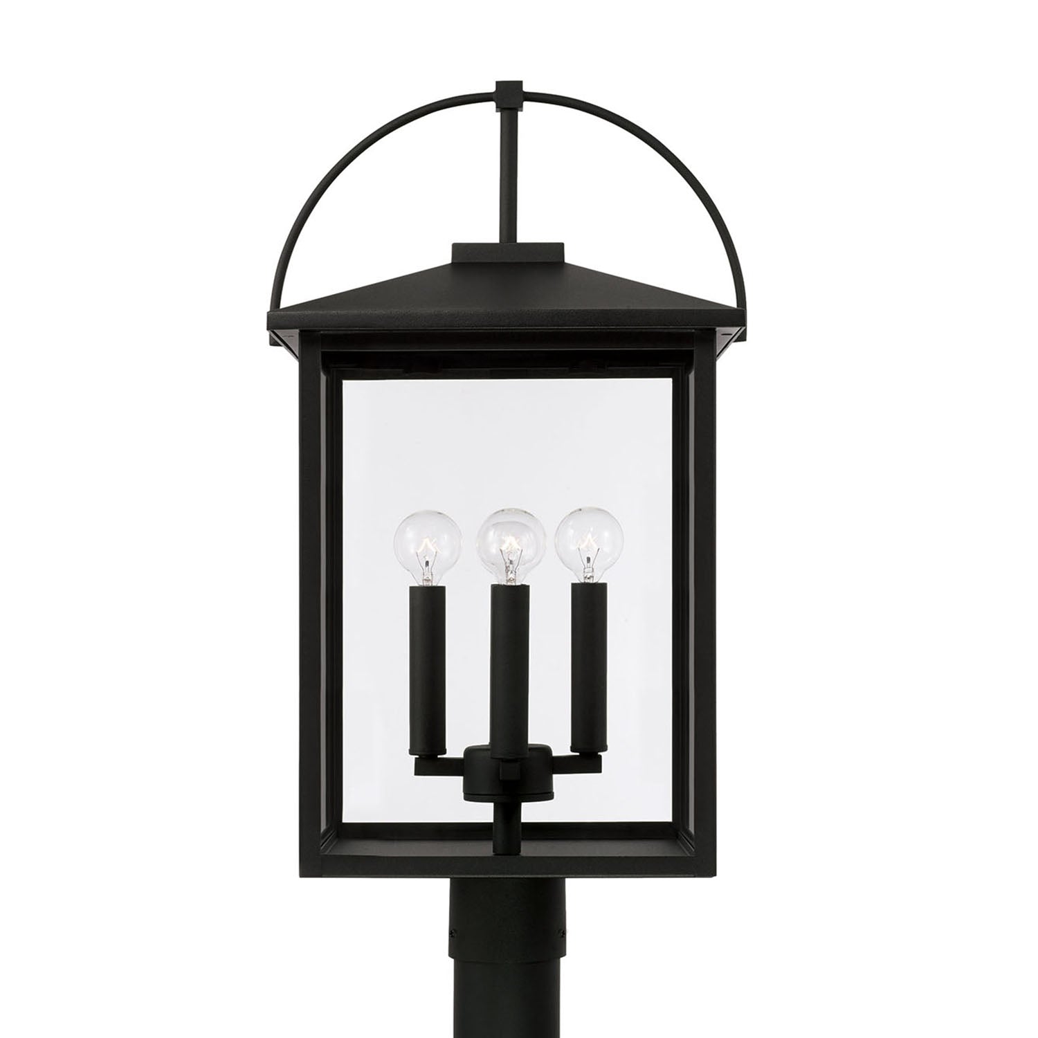 The refined elegance of the Darby Outdoor Post Light brings sophisticated charm to your exterior spaces with its distinctive architectural silhouette and classic post-mounted design. This transitional fixture seamlessly blends classic and contemporary elements, featuring a clean-lined lantern frame topped with a gently sloped canopy that creates visual balance and modern appeal. The rich matte black finish beautifully contrasts with the clear glass panels, creating an inviting beacon for pathways, driveways, and garden areas. Perfect for illuminating outdoor walkways and creating a welcoming atmosphere throughout your landscape, this versatile post light combines timeless sophistication with reliable performance.
