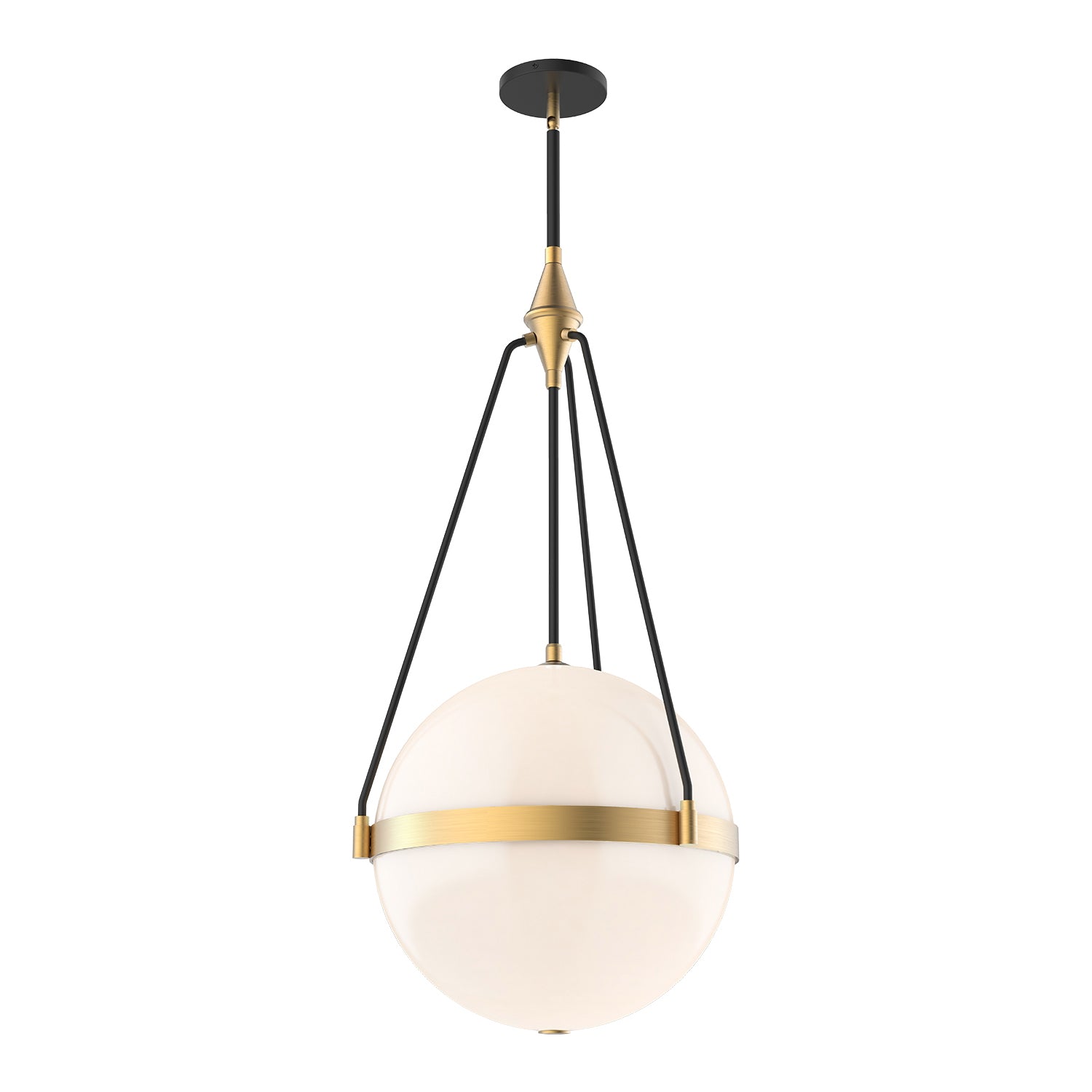 The Darcy Large Pendant features a striking design with a luminous milk glass sphere suspended within a geometric framework. The opaque white glass globe is accented by a Brushed Brass equatorial band and supported by three slender Matte Black rods that create an elegant silhouette. This mixed-metal ceiling light combines contemporary styling with timeless materials, creating a focal point that's both sophisticated and eye-catching. Measuring 18" in diameter, the Darcy provides beautiful diffused lighting that's perfect for dining areas, entryways, or spacious living rooms. The milk glass diffuser softens light while creating a warm, inviting glow when illuminated.