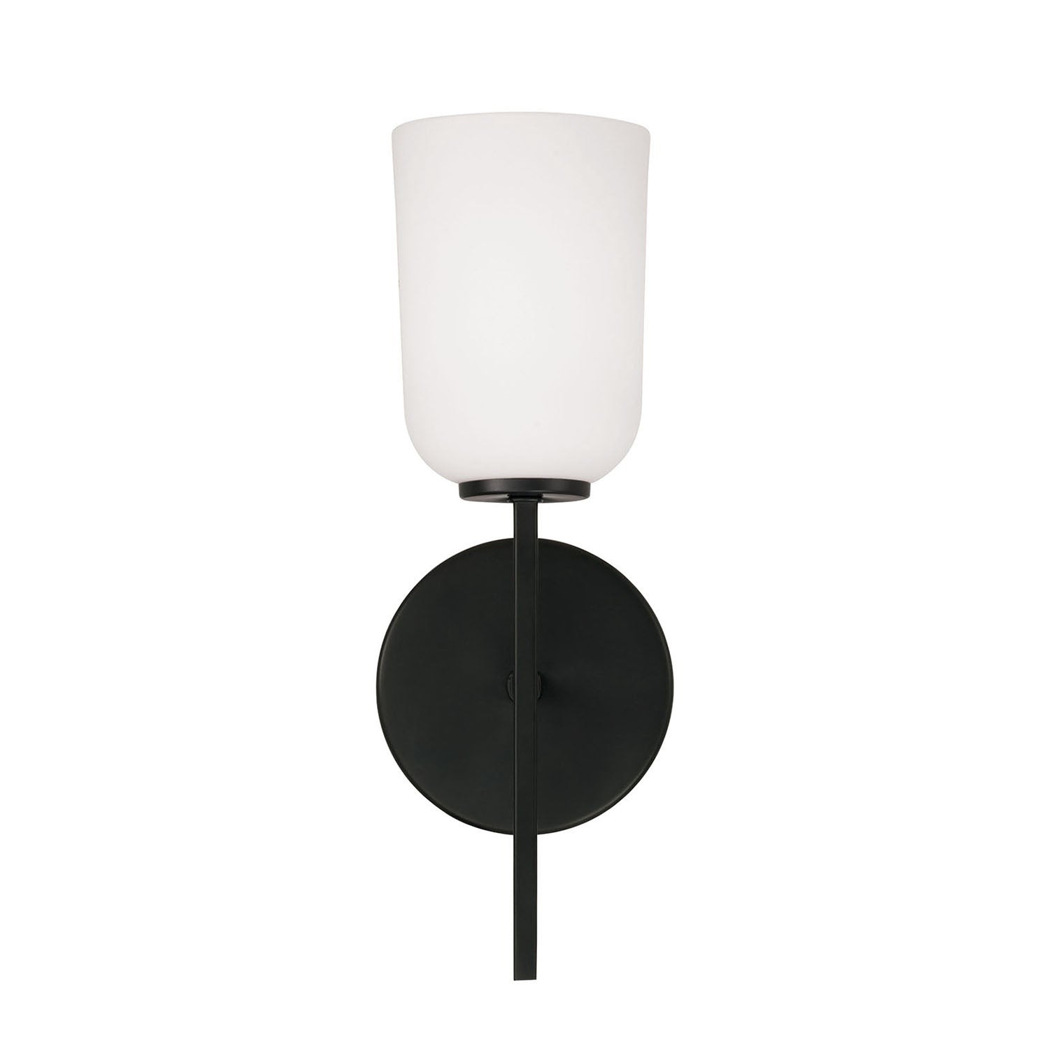 • Classic design with matte black finish featuring linear arm and an opal glass shade