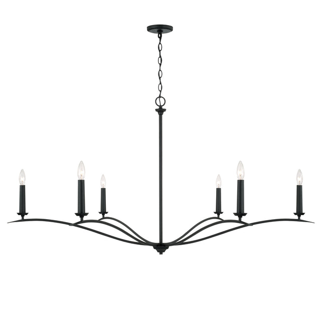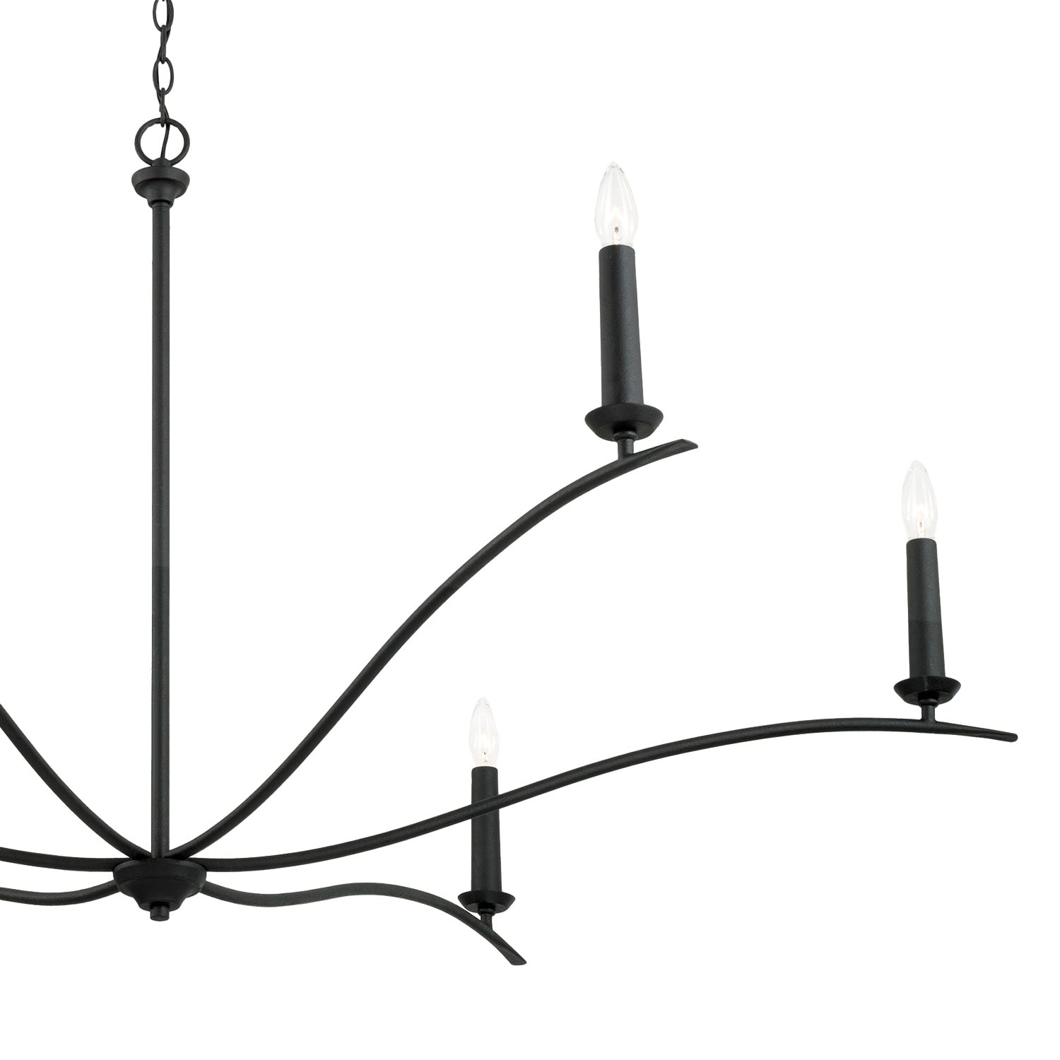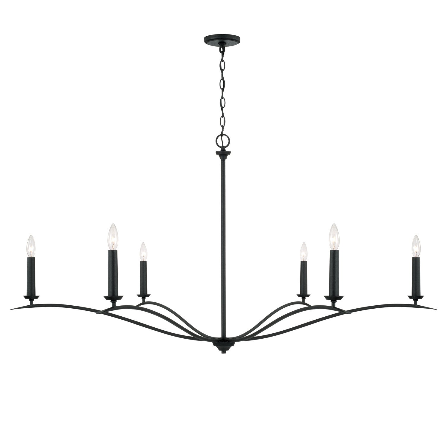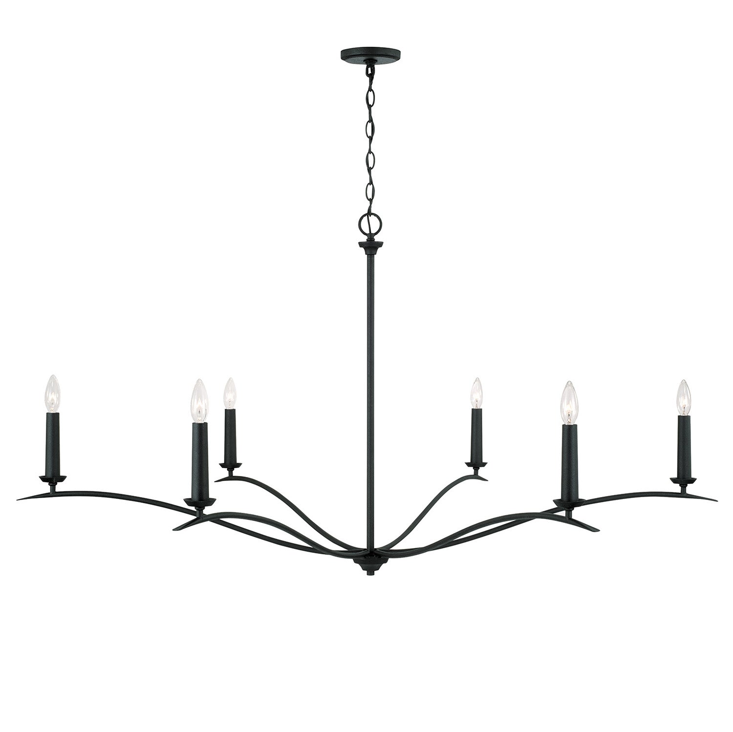 The Eloise 6 Light Chandelier brings farmhouse elegance to any space with its grand scale design and textured black finish. Featuring six candelabra bulbs arranged on sleek linear arms, this impressive fixture delivers brilliant illumination perfect for expansive dining rooms, great rooms, or grand entryways. The black iron finish adds rustic sophistication that complements both traditional and contemporary interiors. The Eloise chandelier combines classic farmhouse lines with commanding presence to create a distinctive lighting statement that enhances your space with timeless charm.