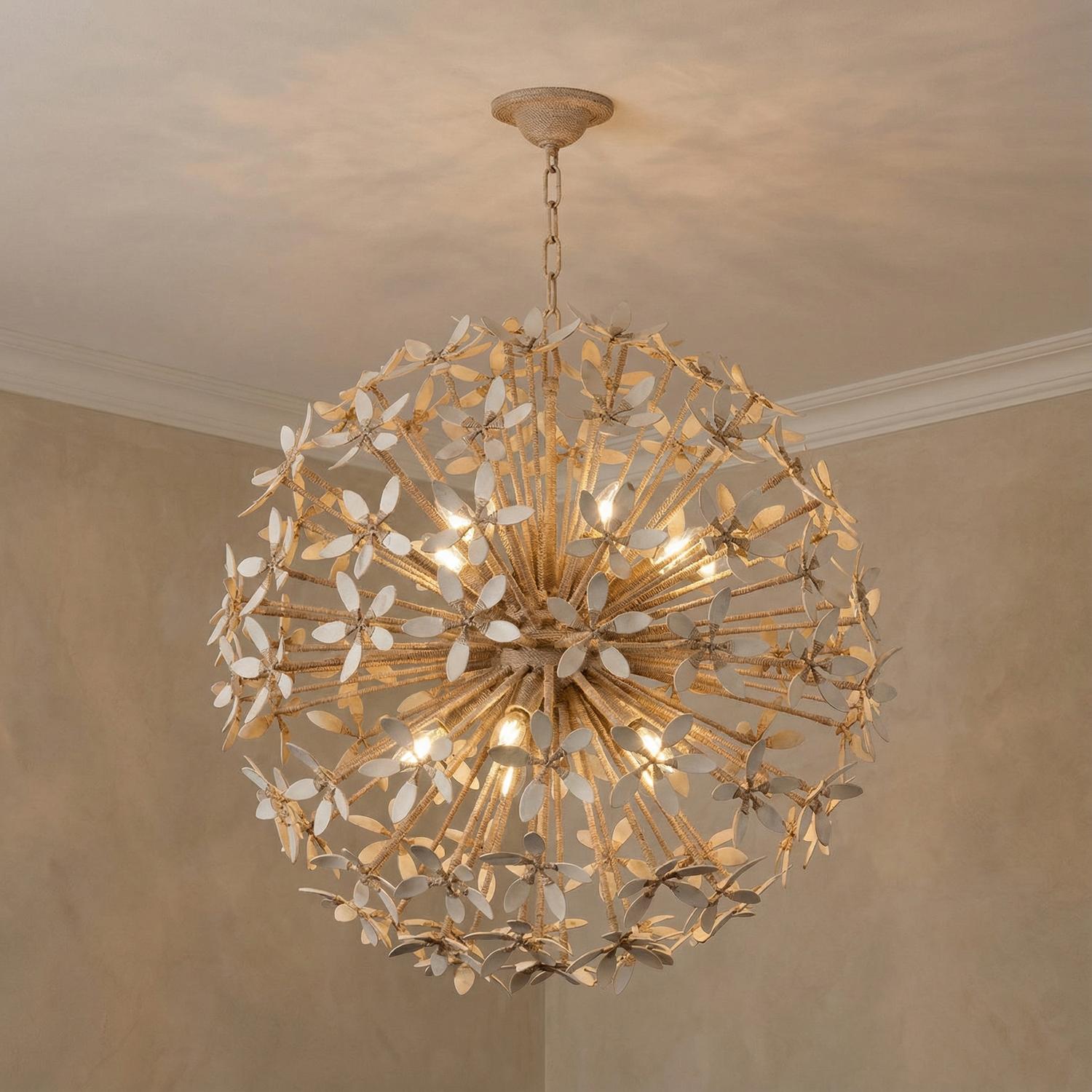 • Luxury botanical chandelier featuring an expansive sputnik shape with natural rope wrapped arms, tipped with coco shell flowers