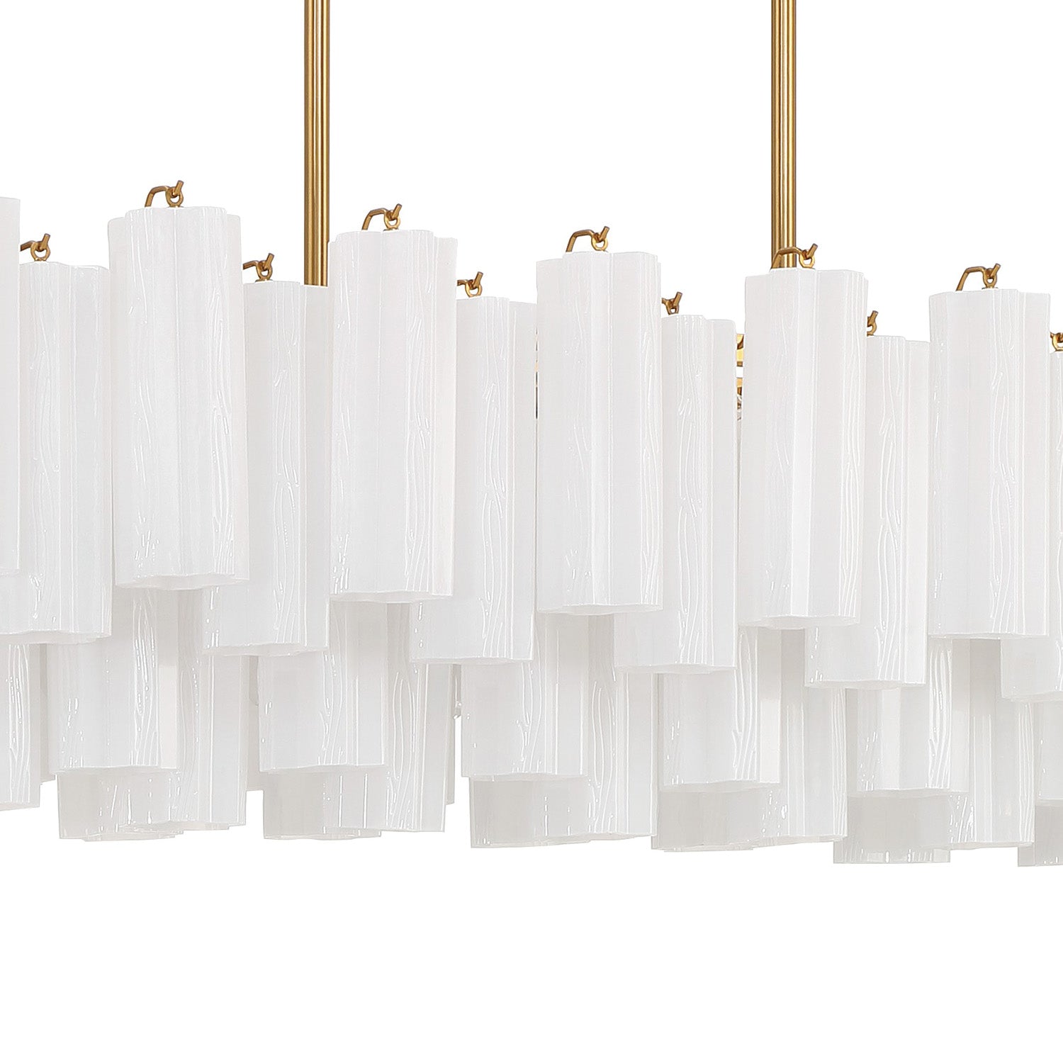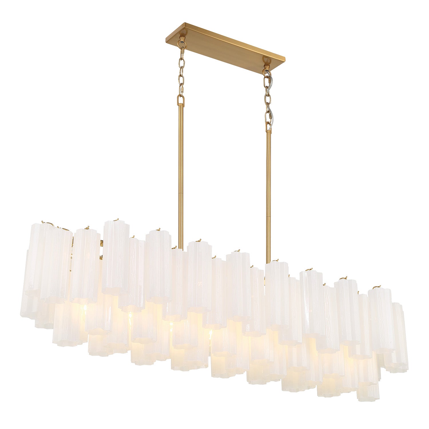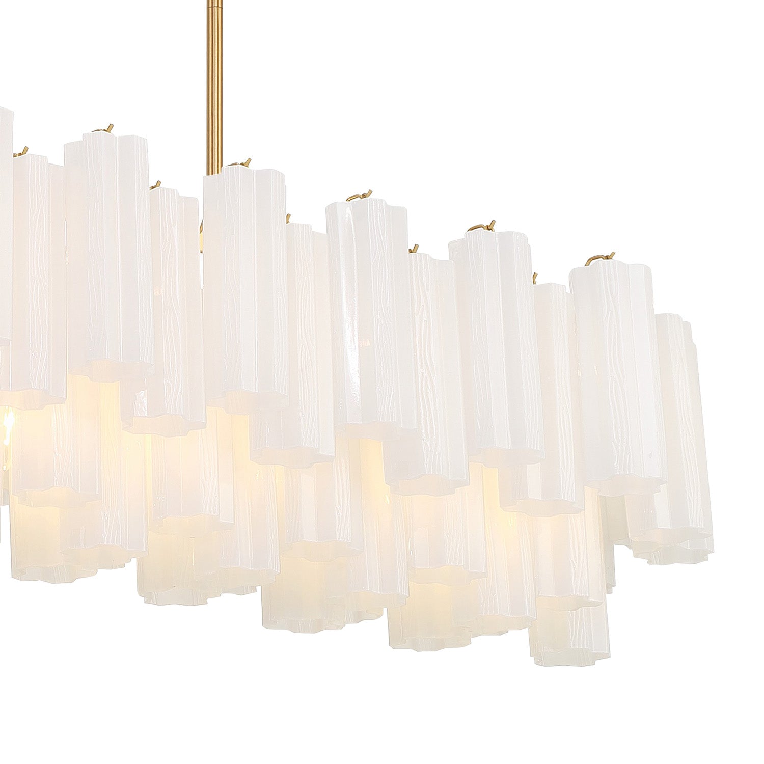 The Grace Linear Chandelier makes a stunning statement with its impressive combination of rich brass finish and pristine white, textured Tronchi glass. This spectacular fixture features cascading textured glass tubes arranged in a dramatic linear formation, creating beautiful light diffusion while commanding attention in dining rooms, above large kitchen islands, and in living spaces. The warm brass framework provides structural elegance, while the crisp white glass delivers soft, evenly distributed illumination that bathes spaces in luxurious ambiance. At an impressive 52" in length with 14 light sources, this grand chandelier delivers both substantial presence and abundant illumination. The multi-panel glass design creates captivating shadows and light patterns throughout the room, making it the perfect centerpiece for sophisticated interiors.
