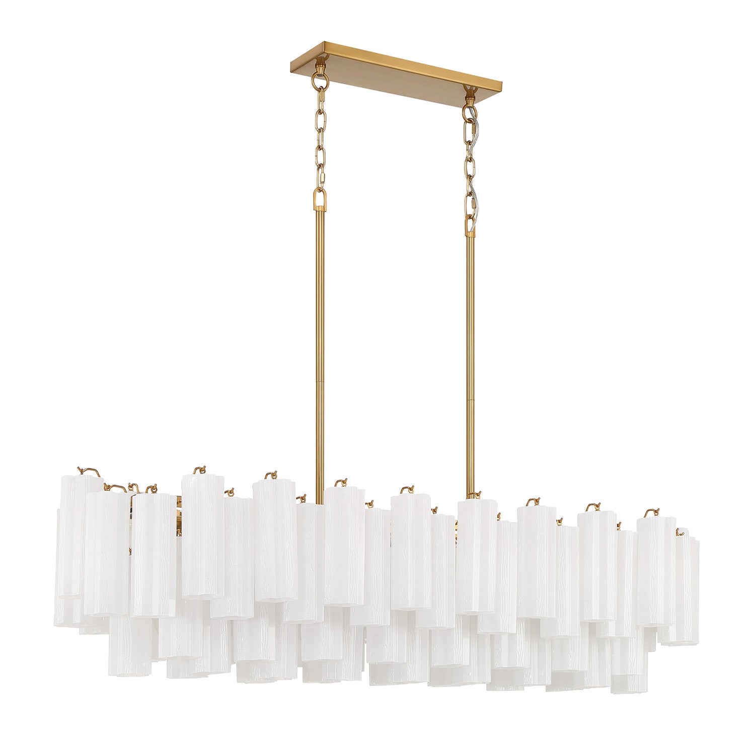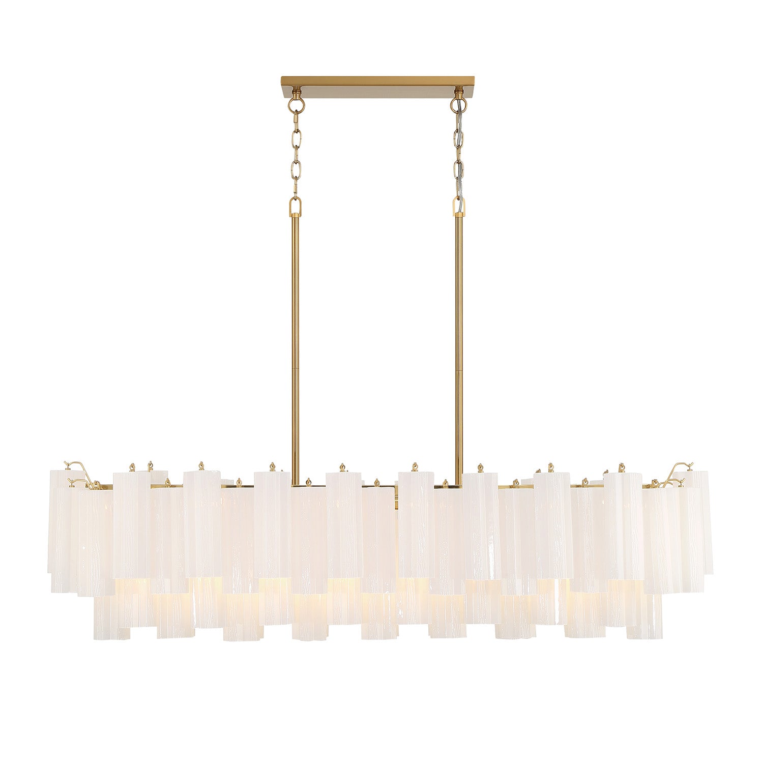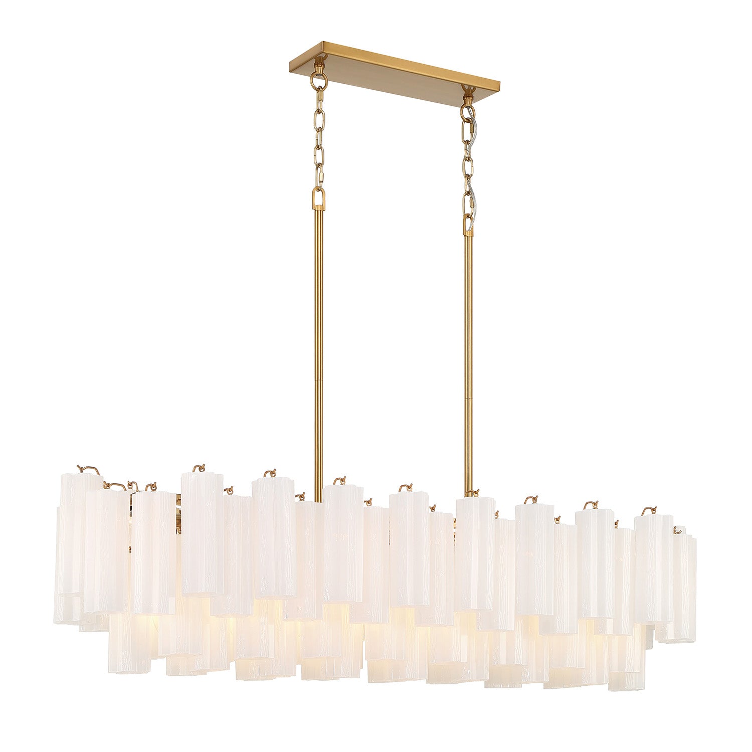 The Grace Linear Chandelier makes a stunning statement with its impressive combination of rich brass finish and pristine white, textured Tronchi glass. This spectacular fixture features cascading textured glass tubes arranged in a dramatic linear formation, creating beautiful light diffusion while commanding attention in dining rooms, above large kitchen islands, and in living spaces. The warm brass framework provides structural elegance, while the crisp white glass delivers soft, evenly distributed illumination that bathes spaces in luxurious ambiance. At an impressive 52" in length with 14 light sources, this grand chandelier delivers both substantial presence and abundant illumination. The multi-panel glass design creates captivating shadows and light patterns throughout the room, making it the perfect centerpiece for sophisticated interiors.