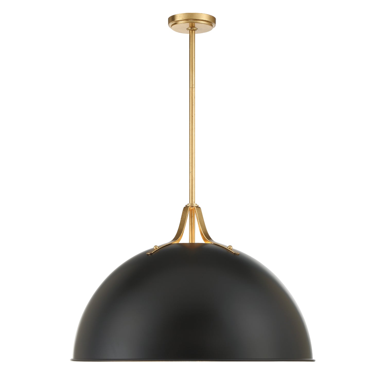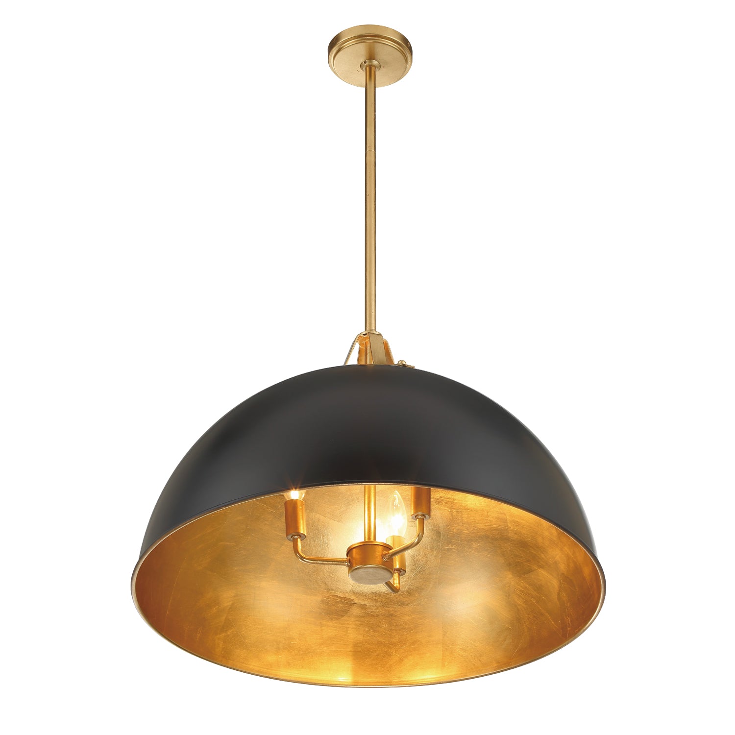 The Grant Pendant features a sleek dome design with a Matte Black exterior and Antique Gold interior finish. This stylish contrast creates a warm glow when illuminated while maintaining a clean, modern silhouette. The extra-large fixture measures 23.5" in diameter and includes multiple rods for a customizable hanging height, making it ideal for large dining tables, grand entryways, or spacious living areas. The industrial-meets-modern aesthetic works well in various interior styles from farmhouse to contemporary. The pendant's three-light configuration provides ample illumination while the metallic interior adds a touch of sophistication and warmth to your space.