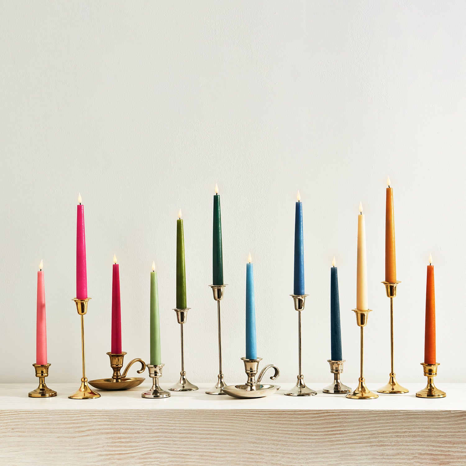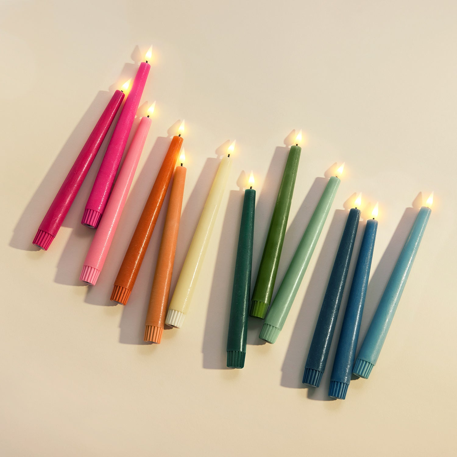 This candle set includes three elegant candles in neutral warm colors, topped with our distinctive Infinity Wick LED flames. Each candle in the pack is a different color, creating a gradient ombre effect when the candles are set together. These battery-powered taper candles are a beautiful, versatile addition to any style of decor, boasting a real wax exterior finished with a unique, distressed texture. Our Infinity Wick tapers fit most standard candle holders, come with a convenient remote control, and arrive in beautiful giftable packaging, making them an ideal holiday or housewarming gift. Place among botanicals to accentuate a floral centerpiece and elevate any dinner table, or add them to your everyday decor for a fun pop of color. Perfect for home, weddings, holidays, and special events.