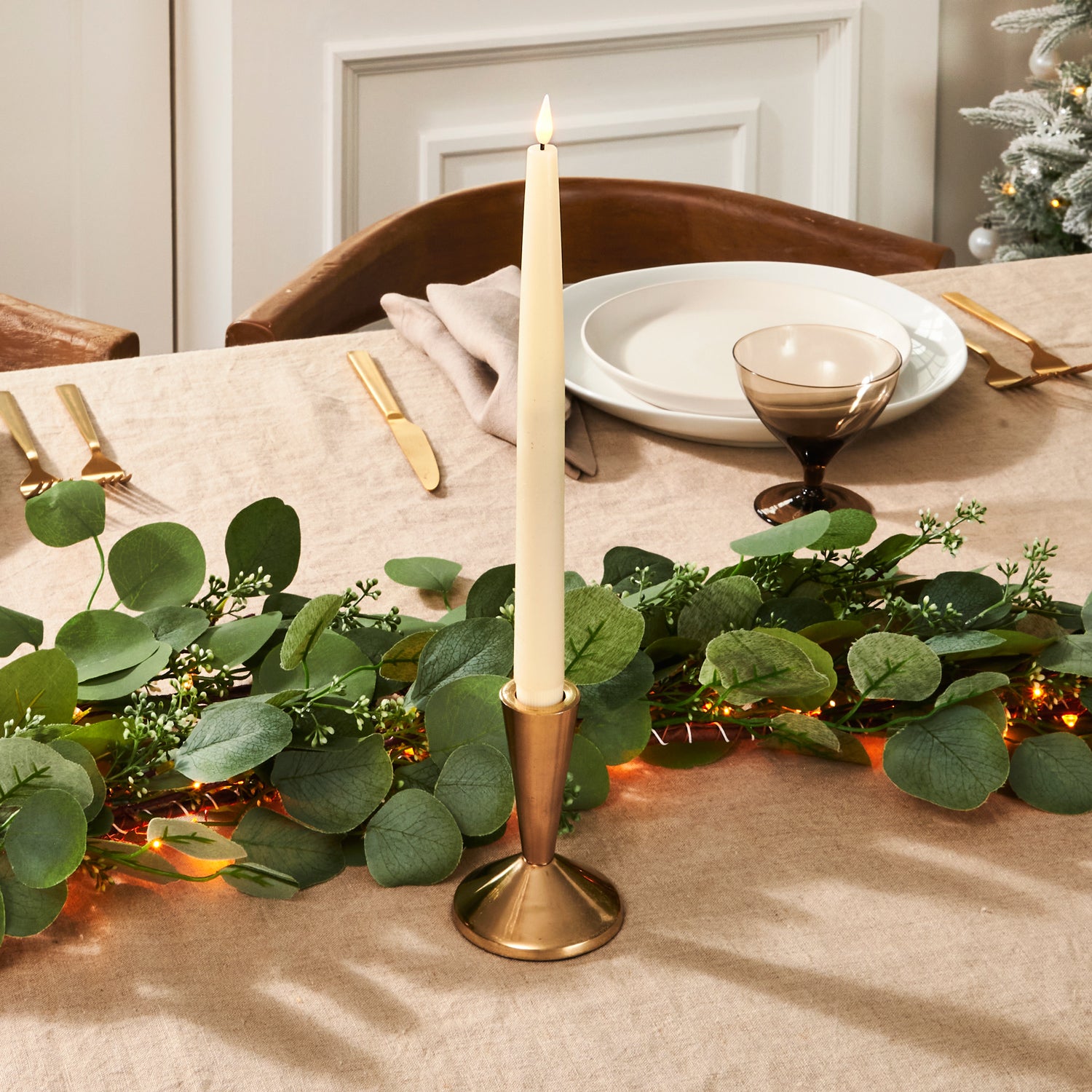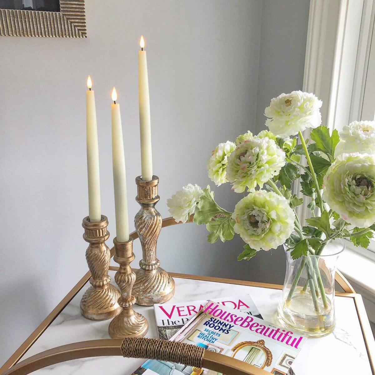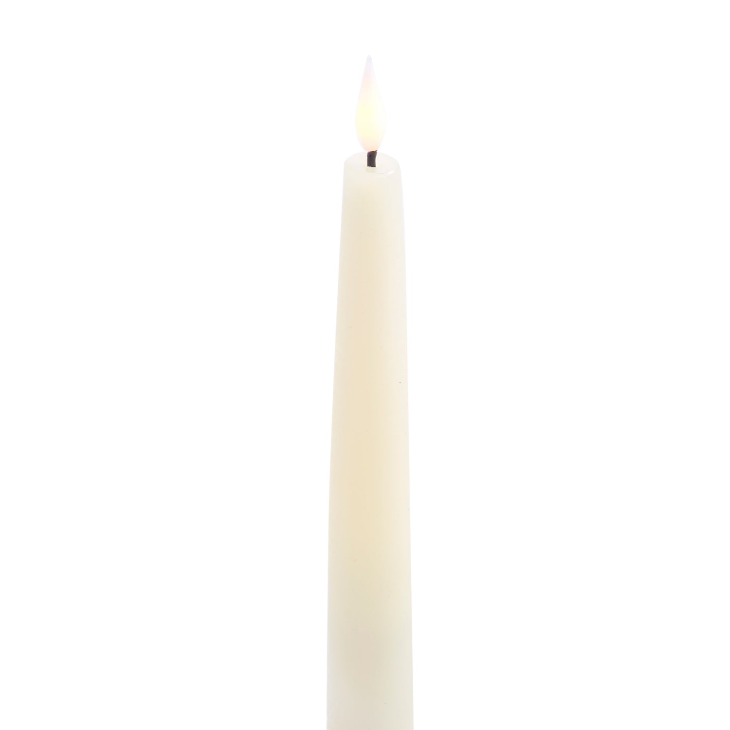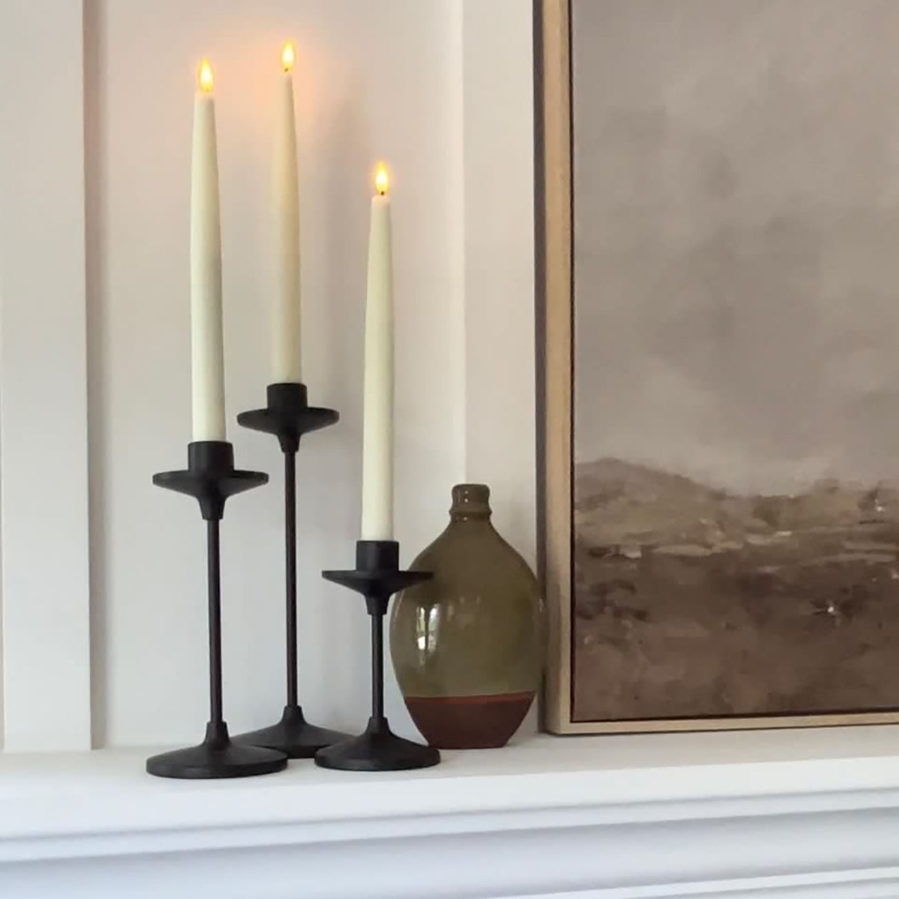 This candle set includes four elegant ivory taper candles featuring our distinctive Infinity Wick flames. They are a beautiful, versatile addition to any style of decor, boasting a real-wax exterior finished with a unique, distressed texture and neutral ivory hue. These tapers will fit most standard taper candle holders, and the included remote with timer make these Infinity Wick Candles an ideal gift for Christmas, housewarming, or for the newlyweds in your family. Place among botanicals to accentuate a floral centerpiece to elevate any dinner table, group together on a side table or mantel, or distribute around a room to bring a touch of cheer to shadowy corners. Perfect for home, weddings, churches, restaurants, and events.