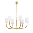 • Iris features six rattan-wrapped curved arms with an aged brass frame and white linen drum shades