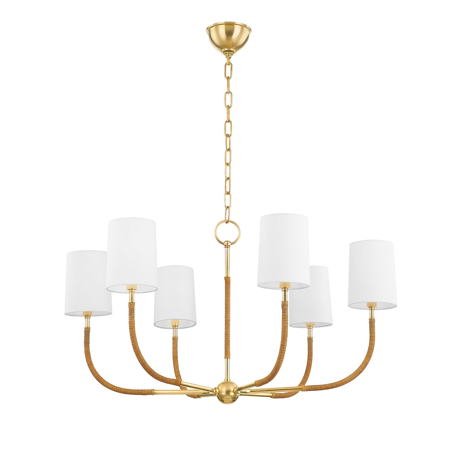 The Iris 6 Light Chandelier brings refined elegance to your home with its distinctive design. Six gracefully curved arms radiate from a central sphere, each wrapped in natural rattan that adds organic texture and warmth to the sophisticated silhouette. The arms gently sweep upward, supporting crisp white linen shades that diffuse light beautifully. Crafted in luxurious aged brass with subtle variations in tone, this statement piece combines modern sensibility with natural elements. The 34" diameter fixture creates a stunning focal point while providing perfect illumination for dining rooms, entryways, or living spaces. Each handcrafted piece features meticulous rattan detailing that ensures a unique character, making the Iris not just a light fixture but a striking decorative element.