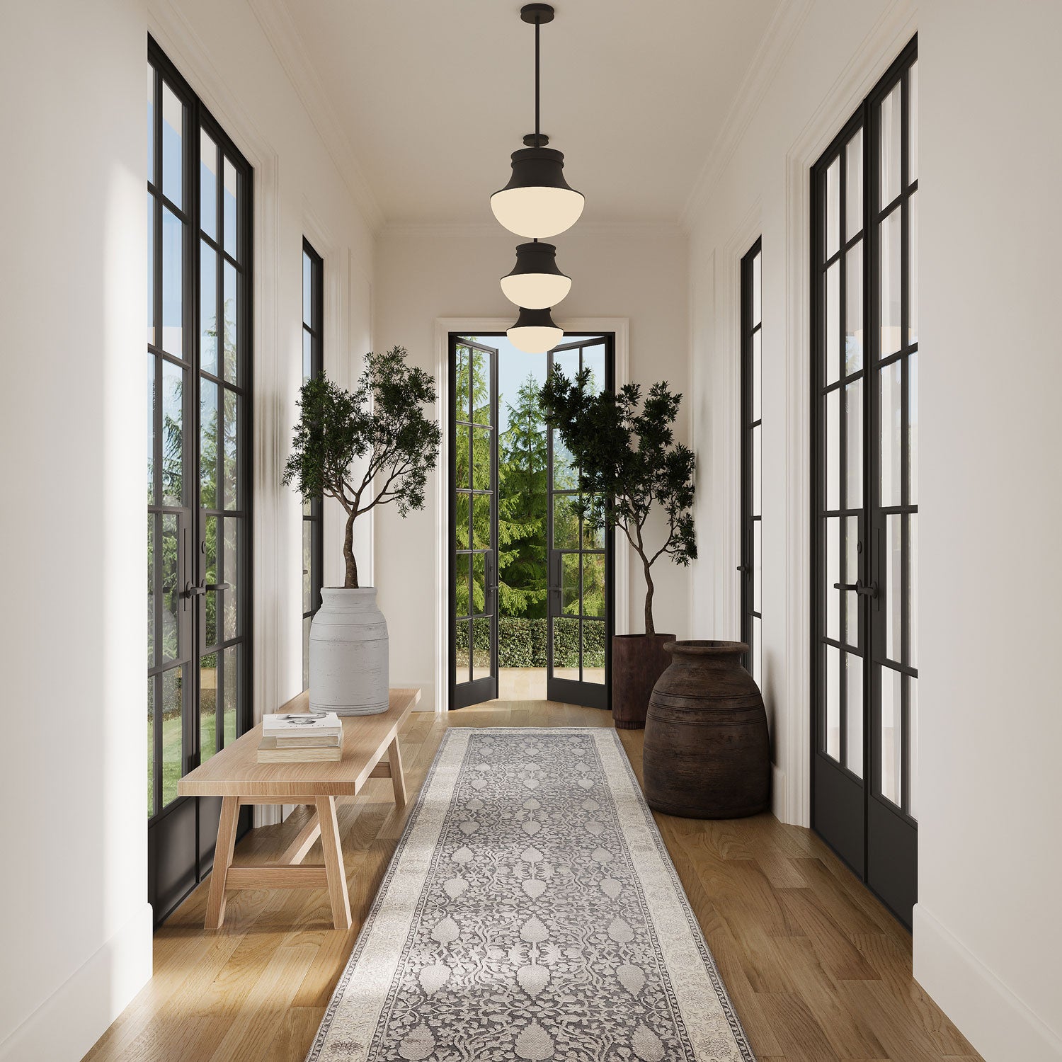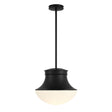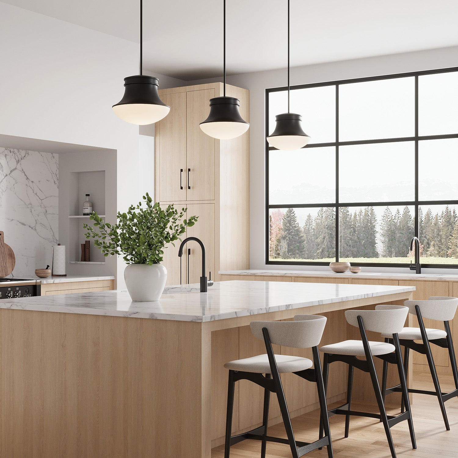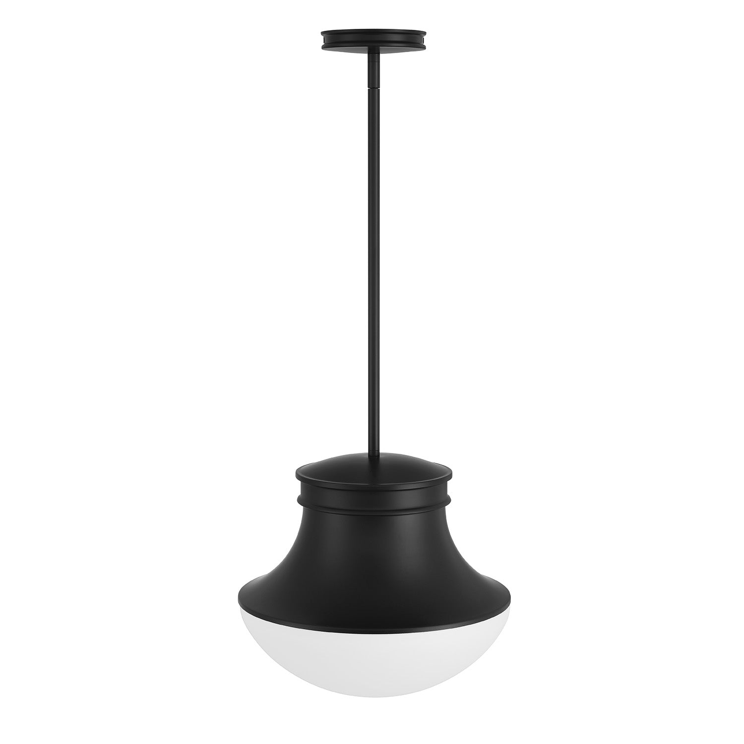 The Jayden Pendant is subtle in design, featuring an alluring geometric-shaped body, smooth white opal glass, and graceful detailing on the canopy. Suspended by adjustable matching down rods, Jayden is a versatile, beautiful option in any home. The matte black finish delivers a bold yet neutral style while the opal glass dome shade creates soft illumination. This 14” round modern pendant light makes an appealing choice for hanging in multiples above a kitchen island or dining table, or as a welcoming pendant in a foyer. Jayden is also available in a coordinating flush mount ceiling light.