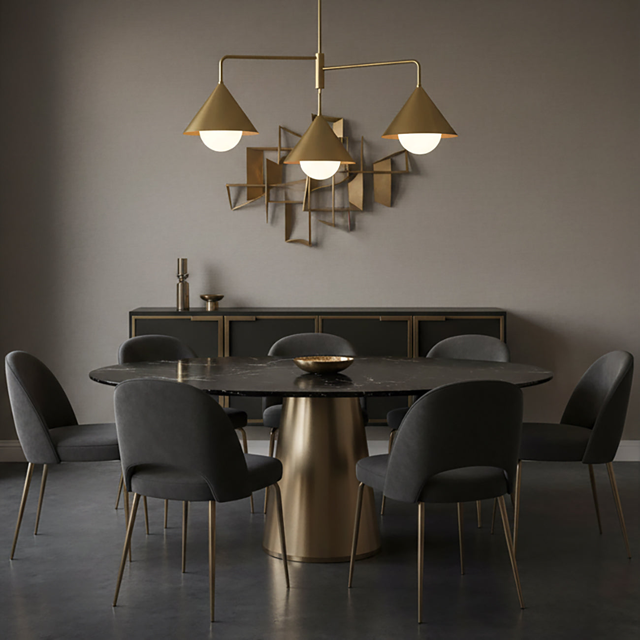 The Juno Chandelier features a minimalist design with three conical brushed brass metal shades, each housing a luminous opal glass globe. This modern ceiling light showcases sleek horizontal arms extending from a central stem, creating a balanced composition that's both modern and timeless. The integrated opal glass elements provide soft, diffused illumination that's complemented by the warm metallic finish of the shades. Measuring 38" in diameter, the Juno makes a striking statement in dining rooms, entryways, or open living spaces. The clean lines and refined aesthetic create a sophisticated focal point that pairs beautifully with both contemporary and transitional interiors.