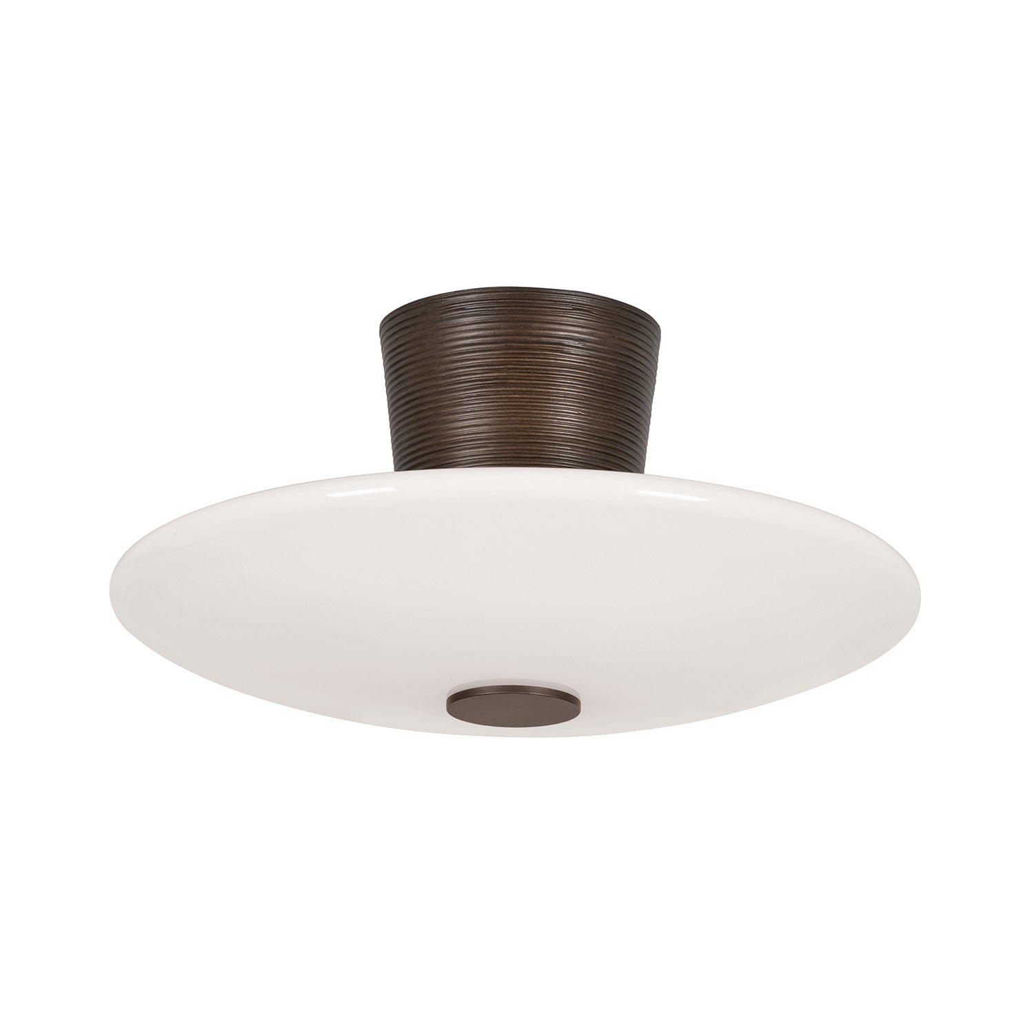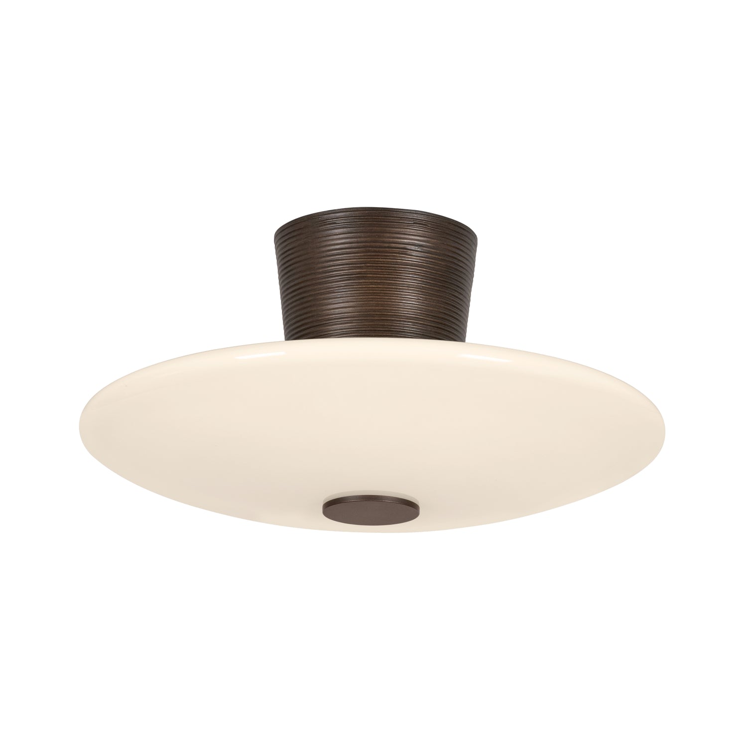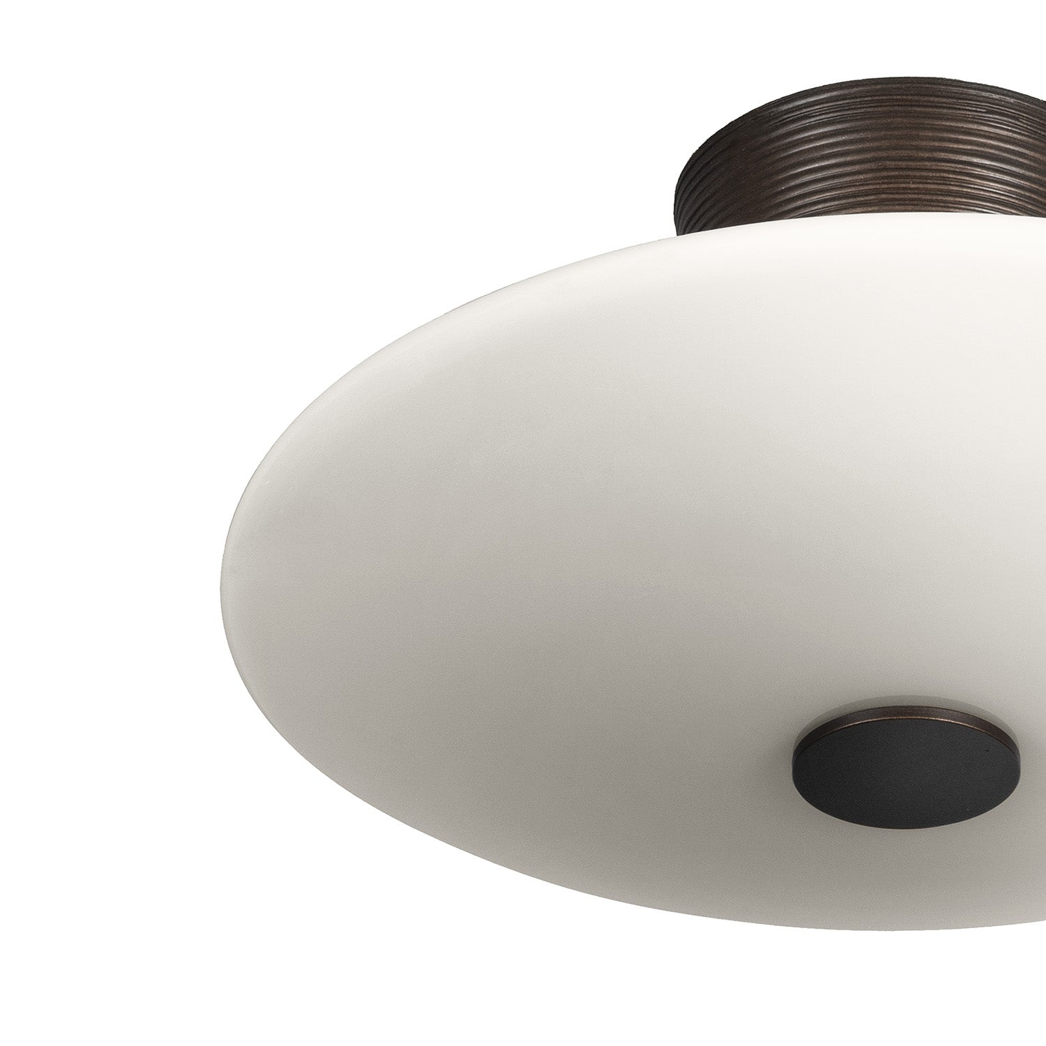 • Modern semi-flush mount featuring a deeply ribbed bronze metal frame and disc-shaped opal glass diffuser
