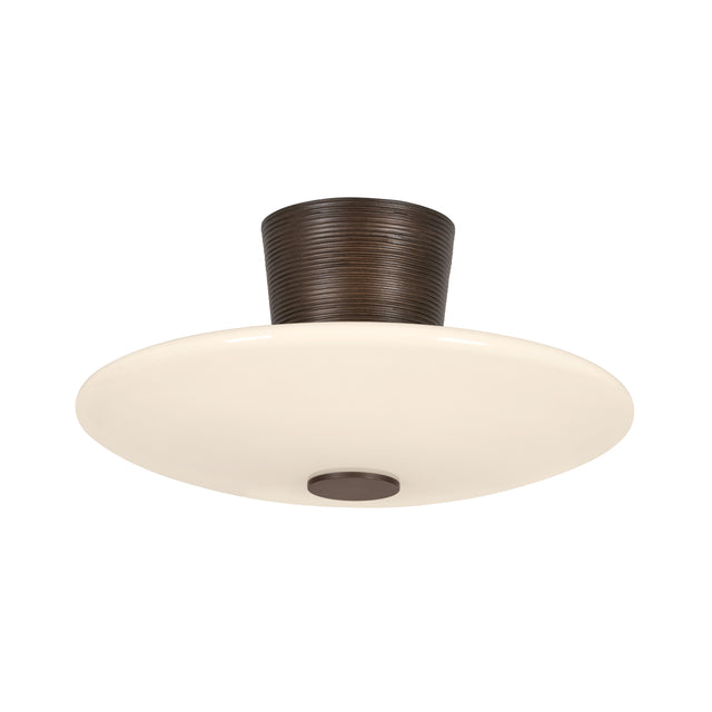 The Kylo Semi-Flush 16" is a modern ceiling light that makes a sophisticated statement with its distinctive textured metal and opal glass construction. The fixture is defined by a deep, ribbed bronze metal frame that anchors a broad, opal glass diffuser, radiating a soft, luminous ambient glow. This flush mount light fixture is thoughtfully designed for low ceilings, making it an ideal choice for a hallway, bedroom, or kitchen. With its UL damp rating and integrated LED source, it offers both functional beauty and versatile appeal. The rich Bronze finish enhances the texture of the ribbed metal frame, delivering enduring style and a perfect blend of elegance and simplicity.