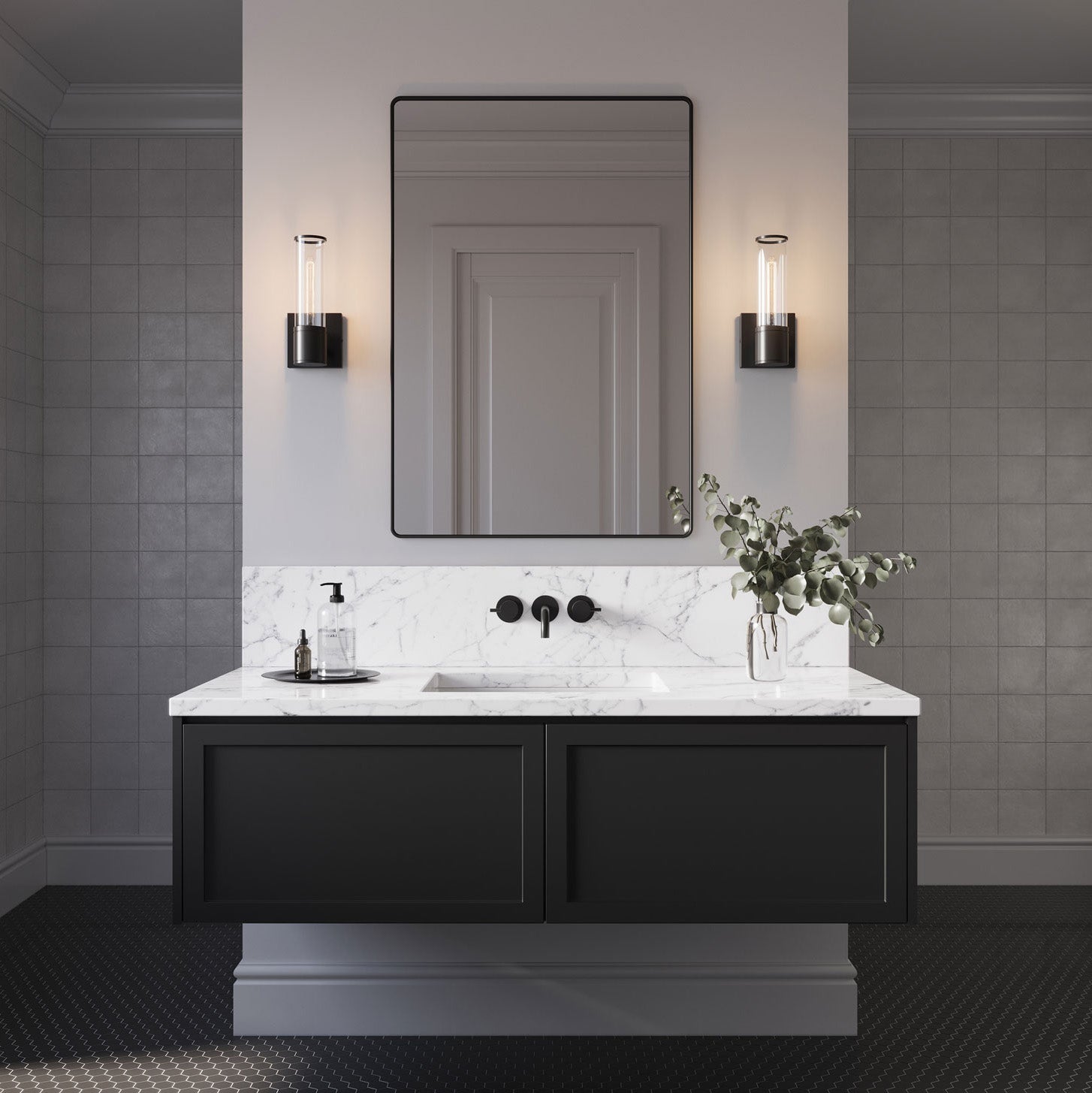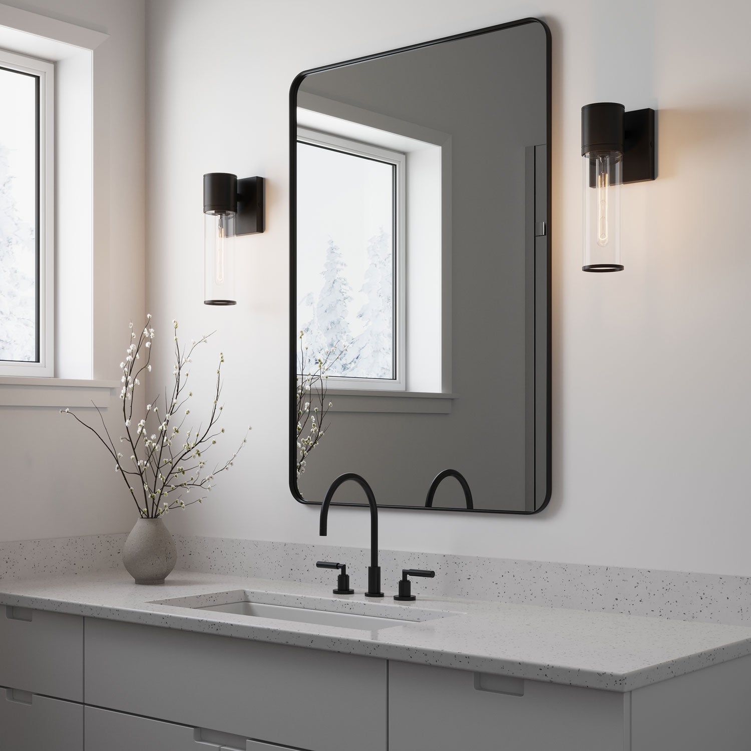Inspired by industrial design with a glamorous touch, the Lea Wall Sconce is the modern touch your room needs. Lea features a cylindrical base paired with a clear glass shade with metal edge detail, set against a square backplate. Versatile and stylish, this wall light can be installed pointing ‘up’ or ‘down’ to fit your personal style and unique space. Ideal in pairs; add ambient, yet direct light by flanking a fireplace, a mirror, or even your favorite painting. Not just for the bathroom vanity, a pair of these modern, eye-catching sconces elevate a foyer or entryway, and look smart flanking a headboard as bedside lights.