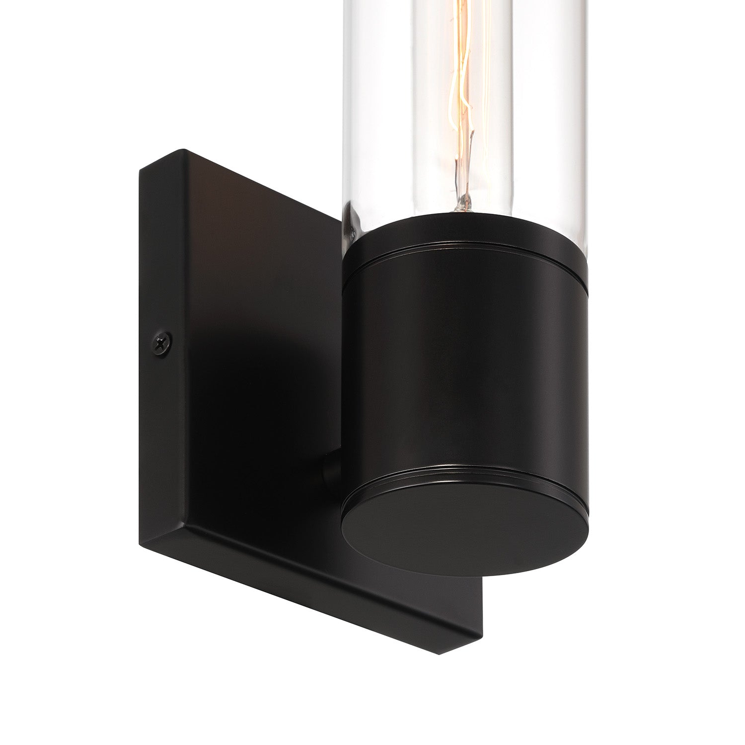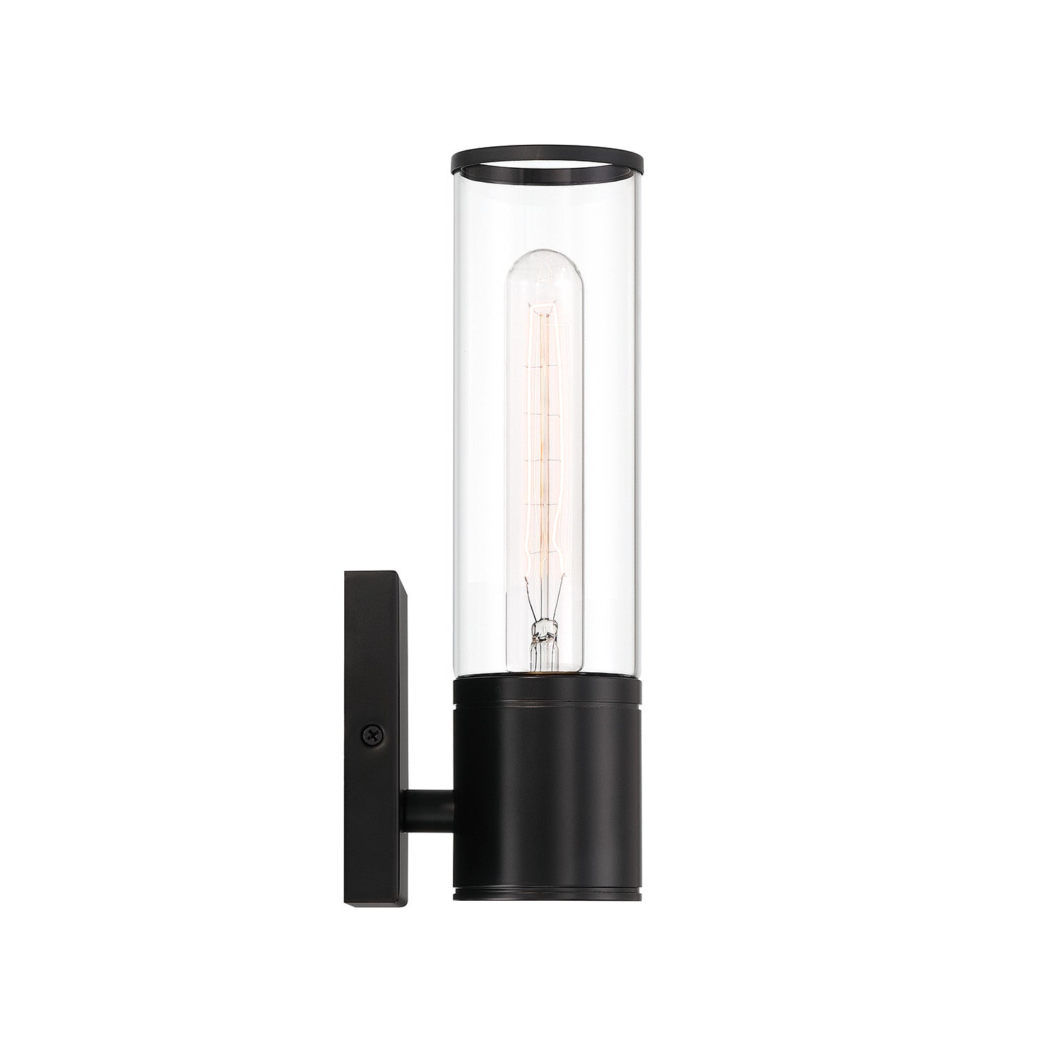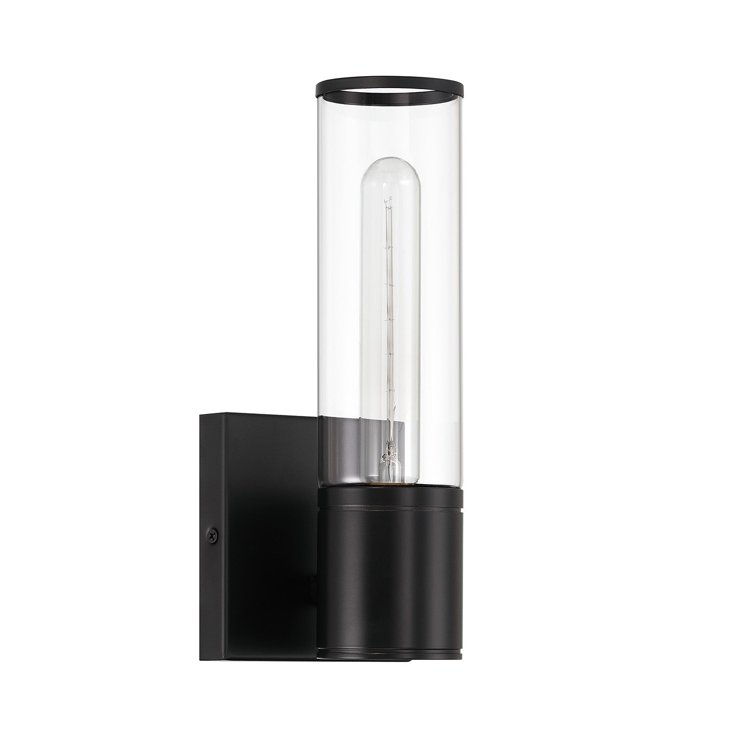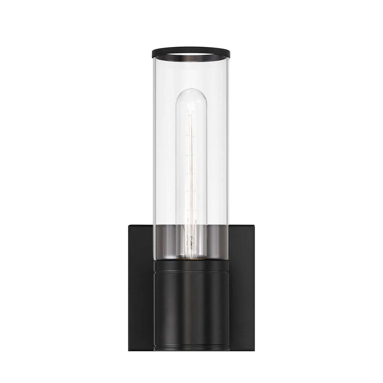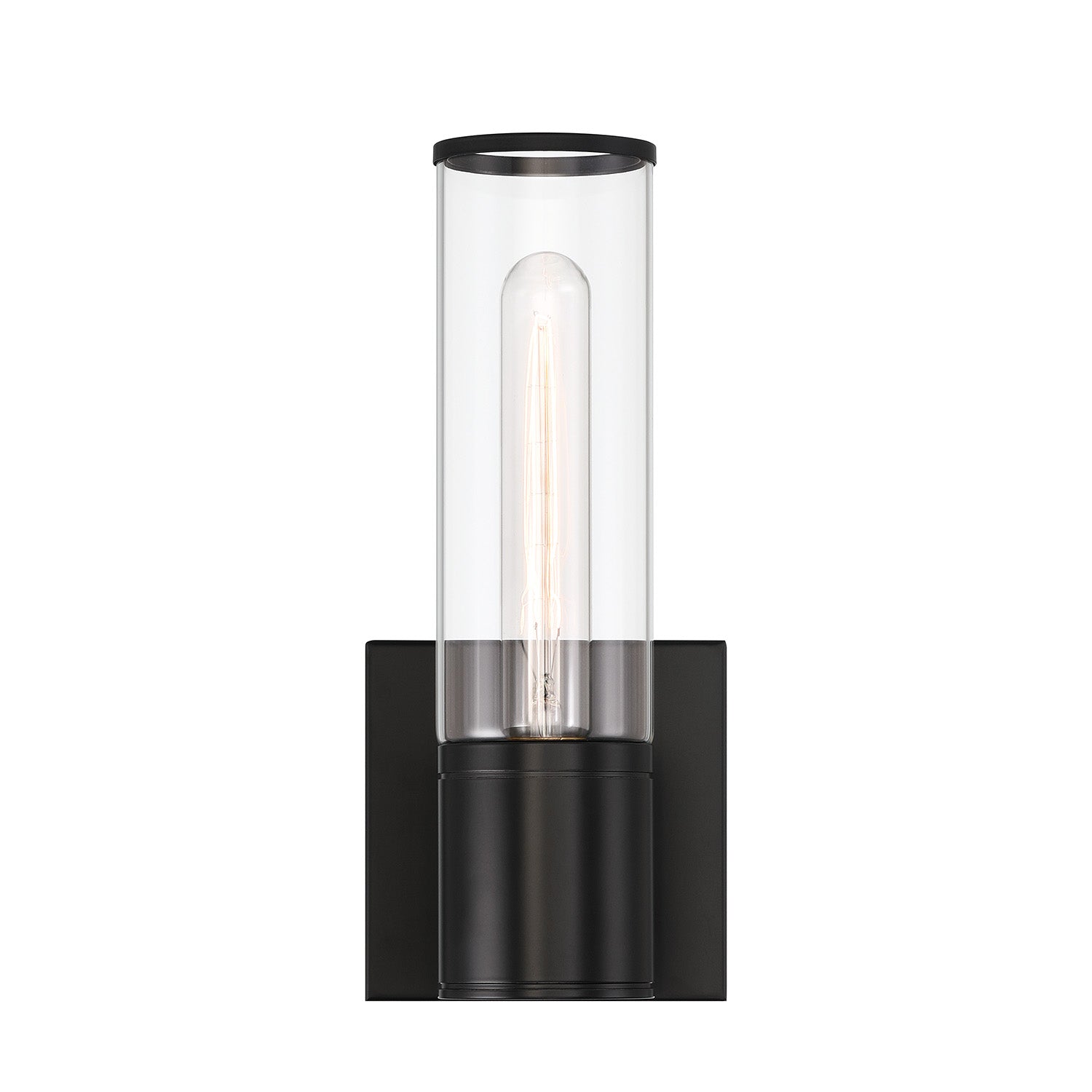 • Single wall-mounted light features a cylindrical base and clear glass shade with metal edge detail, supported by a square backplate, and finished in matte black