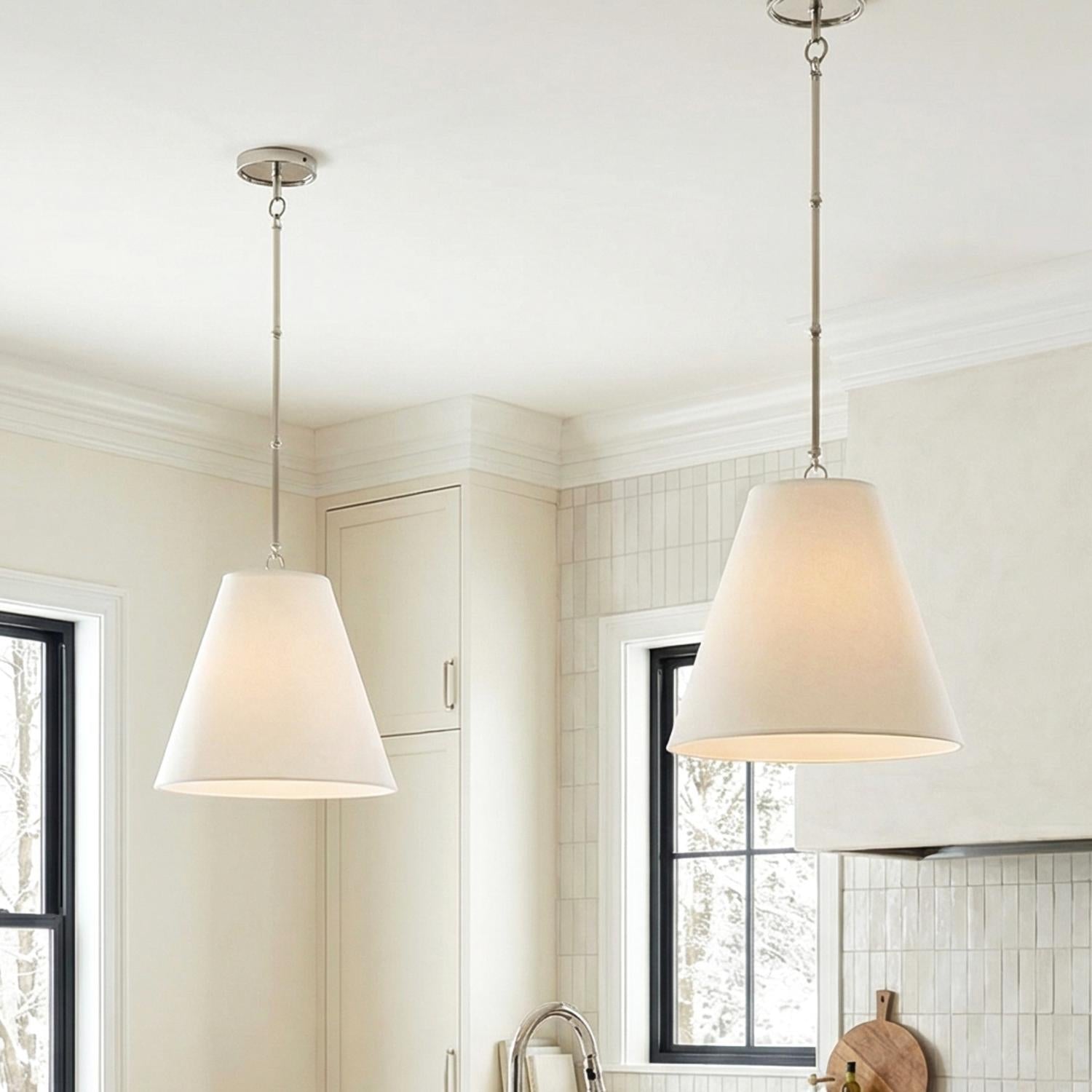 The Luca Medium 15" Conical Pendant is comprised of a gleaming polished nickel metal body paired with a dramatic, tapered white fabric shade. While boasting a classic tapered drum pendant silhouette, the Luca provides updated, smart details- perfectly executed complementary white fabric shade, and adjustable hanging height by way of six-inch rods and decorative couplers. With a traditional shape and modern finishes and textures, this pendant works well in transitional, traditional, or modern spaces. The gorgeous fabric shade is optimal for overhead lighting, helping to diffuse and soften the light from any bulb. The Luca series of fabric pendant lights are perfect in sets above dining room tables, kitchen islands or as a single light in a bedroom, entryway, or kitchenette.