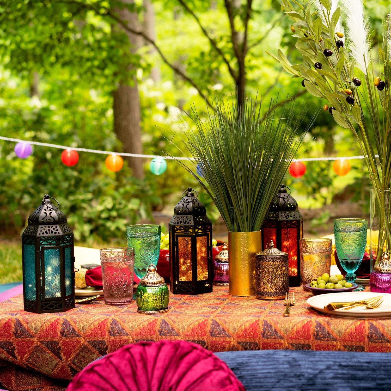 With its romantic punched metal details across the vaulted body, the Marrakesh Lantern with Red Glass blends exotic and practical elements for a striking decorative accent. This unconventional, middle-eastern inspired lantern displays a string of copper wire fairy lights with 20 LEDs captured behind thick red colored glass. The effect is remarkable- creating an otherworldly illusion of enchanting, floating lights. The discreet black battery box is hidden at the base of the lantern, perfect for hanging. The fantastical vibe and quality workmanship make it an ideal addition to a bohemian tablescape, bookshelf or mantle. Activate with the switch at the base and set the timer for effortless ambiance each night. Perfect for home, weddings, churches, restaurants, and events.