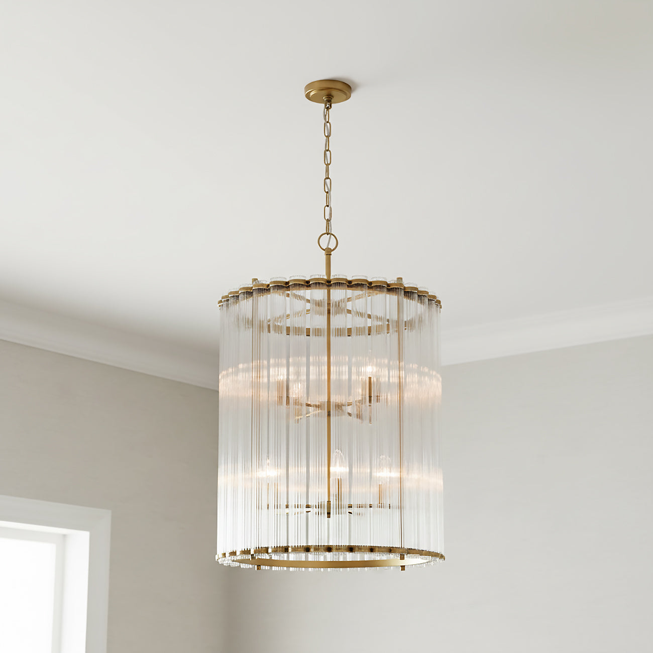 The Nori Chandelier brings transitional elegance to any space with its distinctive design and brass finish. This captivating fixture features beautifully crafted ribbed glass cylinders arranged in a stunning drum formation, creating brilliant, evenly distributed illumination that transforms dining rooms, entryways, and living spaces into sophisticated showcases. The brass metal framework forms elegant round profiles at both the top and bottom of the fixture, while the elongated ribbed glass tubes filter light beautifully throughout the interior space. Brass and ribbed glass elements deliver contemporary luxury with transitional sophistication. At 22" in diameter and 27" tall, this chandelier makes an unforgettable centerpiece that brings elegance and dramatic refinement to any interior.