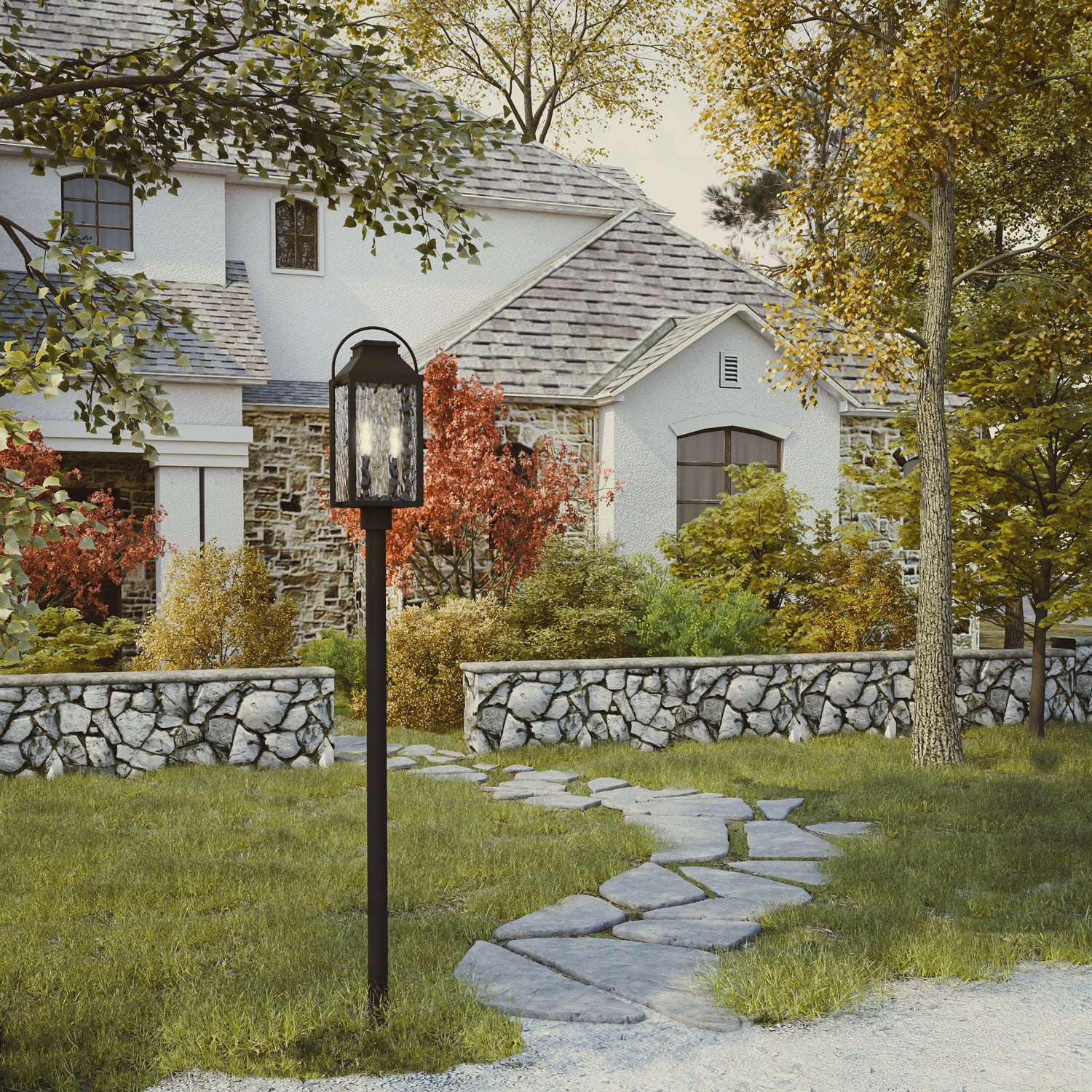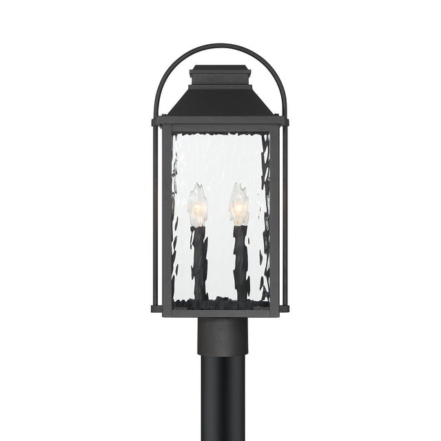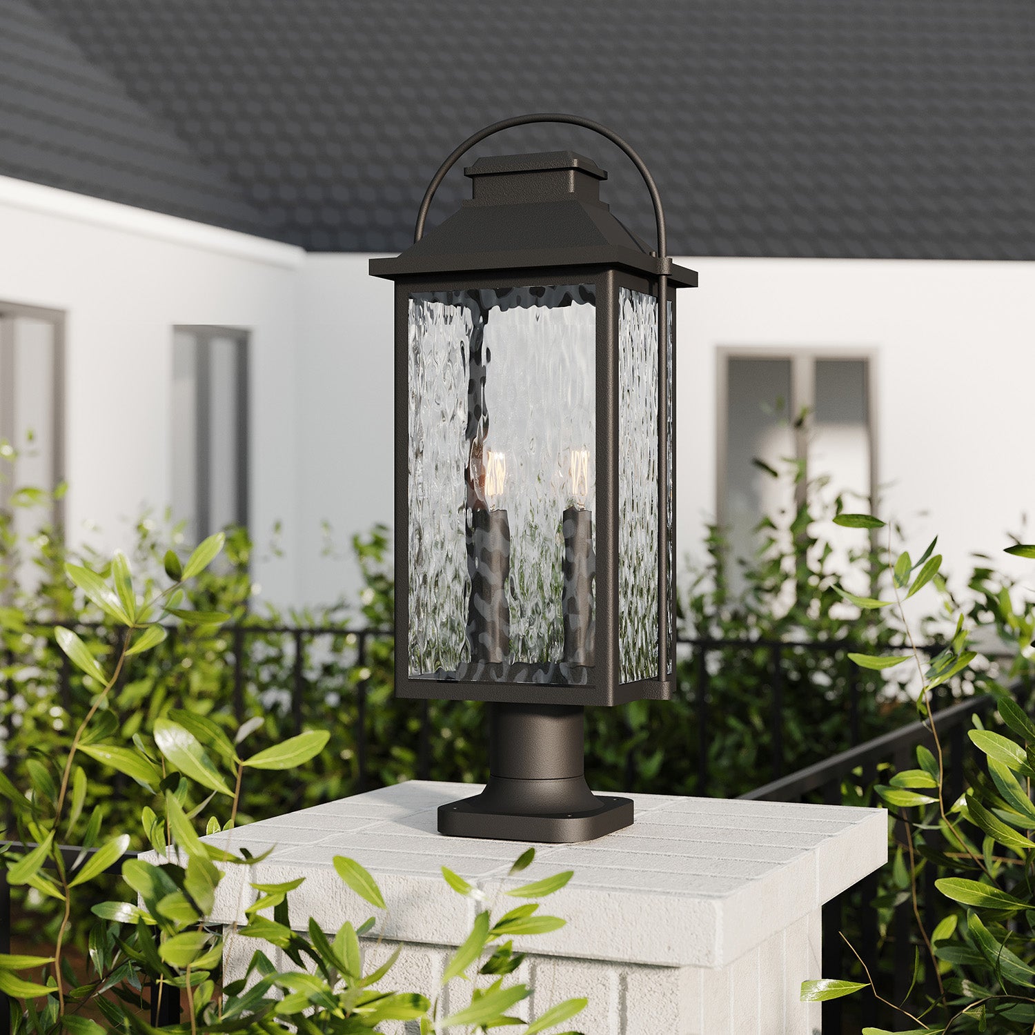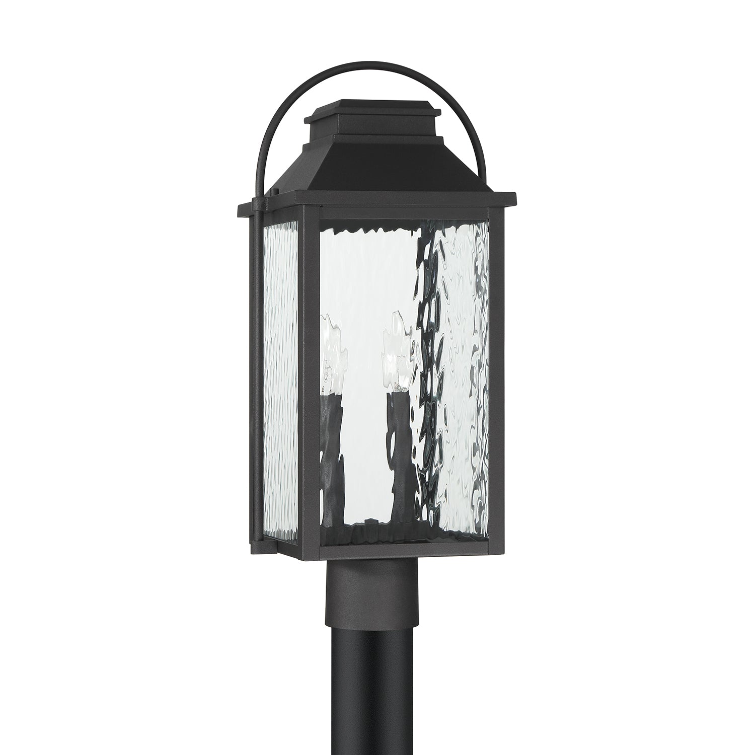 The Preston Outdoor Post Light is a study in architectural design with its stylized tiered top and bold rectangular frame softened with a gracefully curved thin bar reminiscent of a handle. This light also features dual bulbs encased in gorgeous, clear water glass that diffuses the light for a unique look. The distinctive fixture can be mounted atop a round metal post; alternately, it can be mounted to other surfaces with a pier mount. Both mounting options are sold separately and come in matte black. Post lights bring life to any front yard, walkway, or outdoor living space. The Preston Outdoor Post Light is part of a full collection of fixtures to complete your outdoor lighting needs.