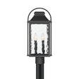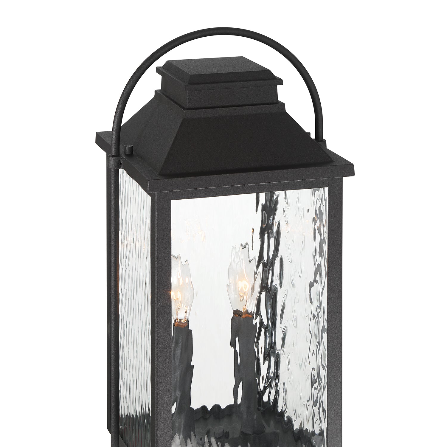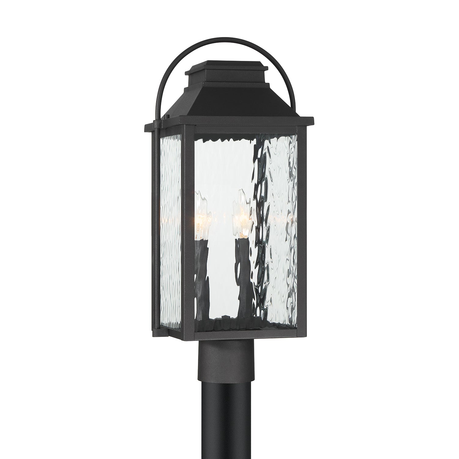 • Post or pier mounted fixture features dual bulbs encased in a matte black rectangular frame with unique clear water glass panels