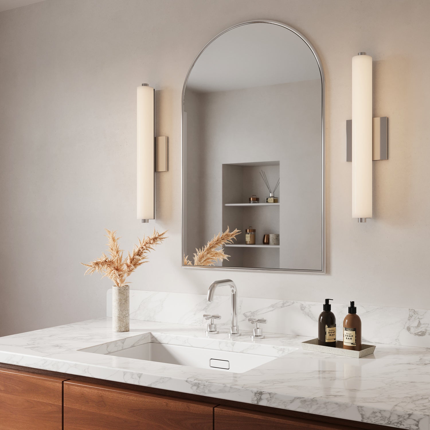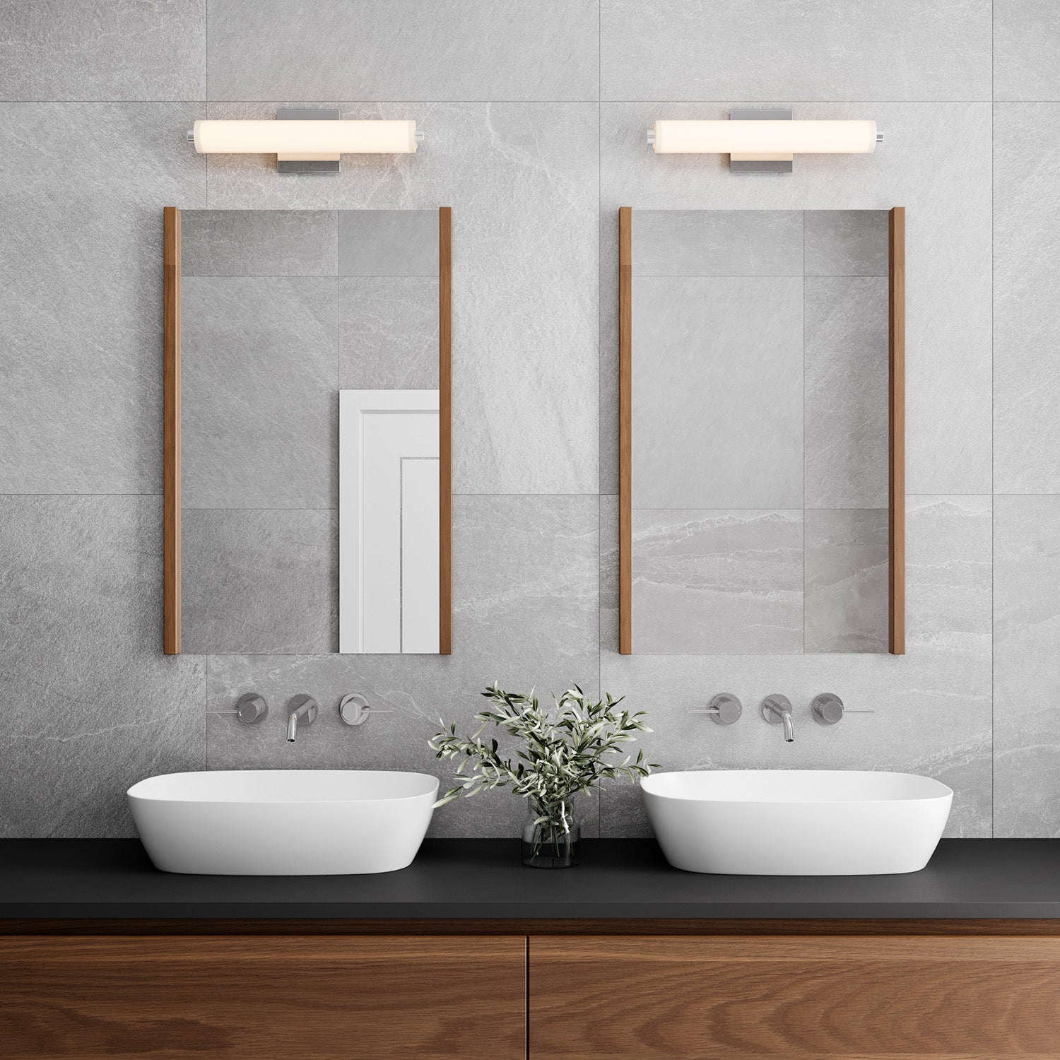 The Ronan LED Vanity Light features a clean and contemporary design, paired with exceptional functionality. This 18” LED bath bar provides long-lasting illumination with an opal glass shade that produces a soft, diffused light that prevents glare and harshness. The Ronan features smooth dimming capabilities and can be mounted horizontally or vertically, making it ideal for use in a bathroom above a vanity or as wall sconces flanking a mirror. This tube-shaped wall light is finished with a chrome backplate and end caps, making a beautiful statement in contemporary and modern bathrooms. The Ronan Collection is ADA compliant, and currently available in three finishes for the 18” size, and two finishes for the 24” size.