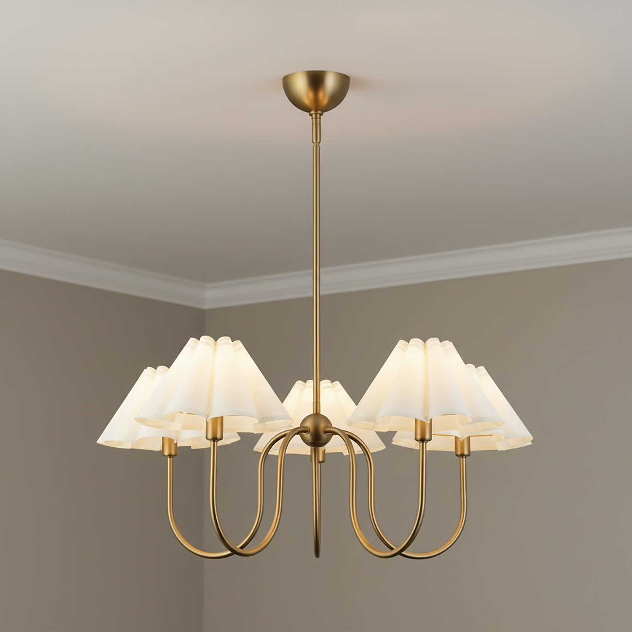 The Rory 5 Light Chandelier brings timeless sophistication with its stunning oversized pleated linen shades and warm brushed brass finish. This captivating fixture features five beautifully scalloped white linen shades that create the charm of a vintage market treasure, delivering warm, diffused illumination perfect for dining rooms, living spaces, and bedrooms seeking elegant warmth with distinctive character. Rory's five swooping arms add to the soft, whimsical appeal of this fixture, and are connected by a spherical center hub. At 31" diameter with adjustable hanging height and charming presence, this chandelier makes a timeless statement that gives your home a stylish makeover with vintage-inspired elegance.