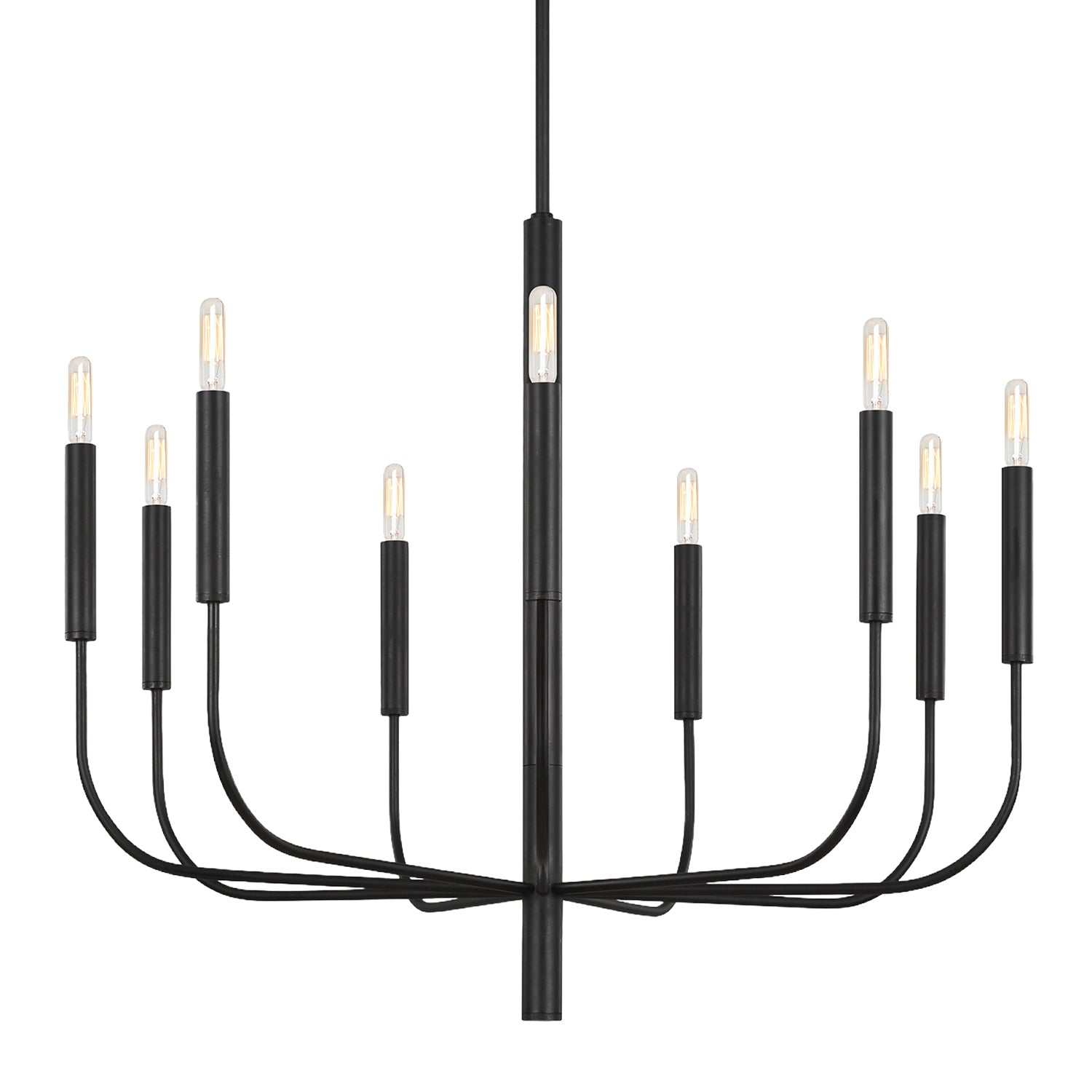 The Thayer 9 Light Chandelier features a single tier design that supplies ample lighting for your daily needs while adding a layer of style to your home's decor. This striking 30" chandelier showcases graceful, seamless curvature and elongated tubular arms that lend fluidity and modern appeal to the classic minimalist silhouette, perfect for large dining rooms, living spaces, and areas seeking substantial lighting with contemporary sophistication. The antique iron finish brings rich character while the nine-light configuration provides abundant illumination throughout expansive spaces. Damp-rated for added versatility, this chandelier delivers both style and functionality for various environments. With its dimmable capabilities and sloped ceiling compatibility, this chandelier transforms any space with distinctive style and performance.