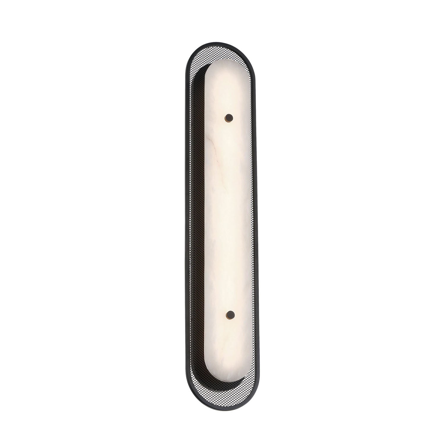 The Vance LED Wall Sconce transforms ordinary walls into illuminated art with its distinctive elongated oval form and bold matte black detailing. This elegant fixture showcases an alabaster center that creates a gentle, uniform glow when illuminated, while the surrounding metal mesh matte black frame casts a beautiful halo effect that makes the entire piece appear to float effortlessly against the wall. The harmonious blend between the natural alabaster and matte black elements seamlessly merges vintage glamour with contemporary sophistication. At 30" long with ADA-compliant design, this sconce delivers both striking appeal and superior practical illumination for contemporary interiors.