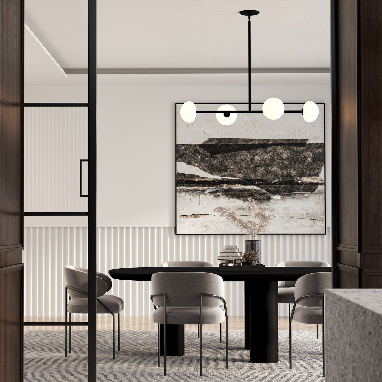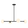 • Features four white opal glass orbs extending from a matte black linear bar, suspended by an elegant round canopy and matching down rods