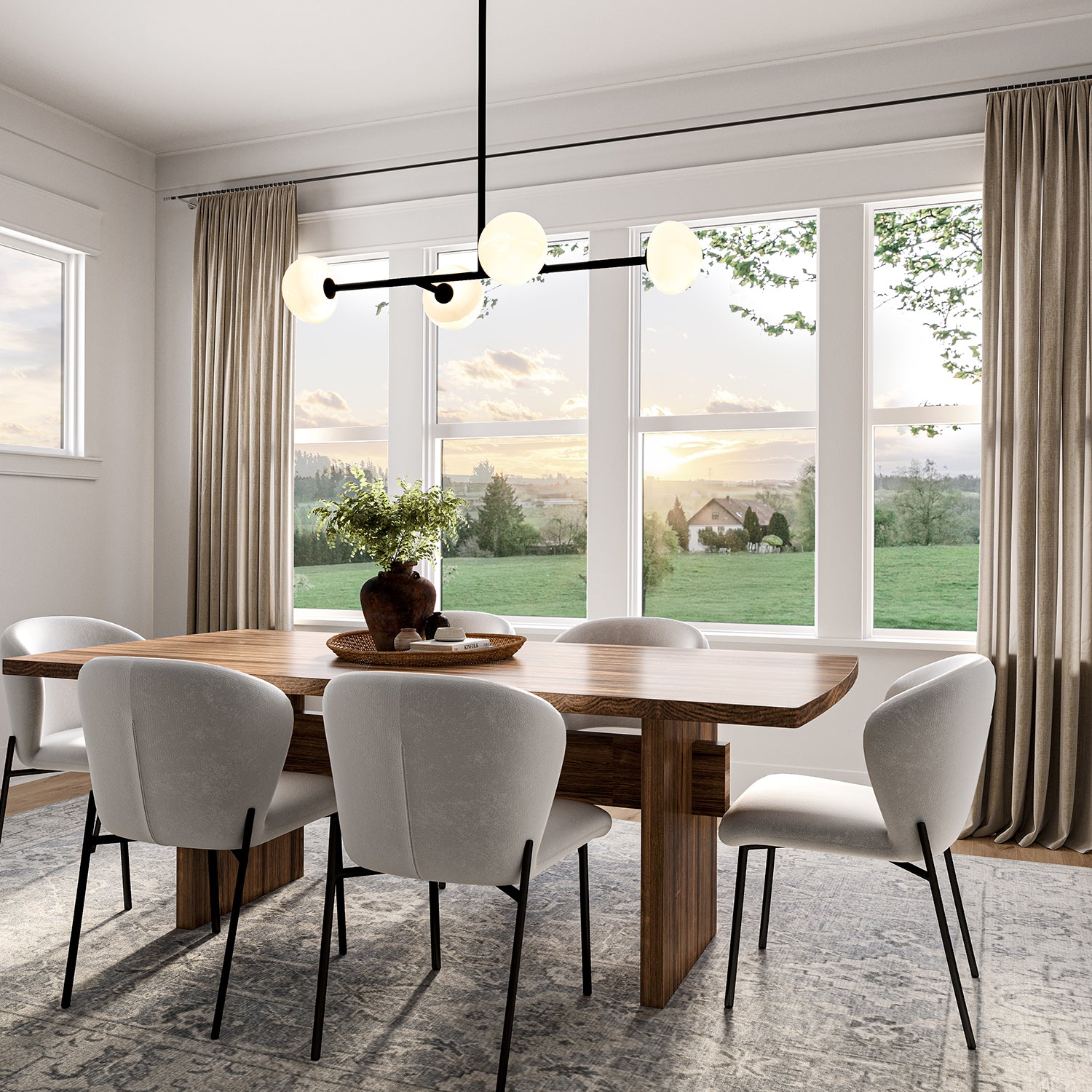 Inspired by mid-century-modern classics, the Vince 4 Light Linear Pendant combines modern styling with LED efficiency. Features four white opal glass orbs extending from a linear central bar, suspended by an elegant round canopy and matching down rods. Endlessly efficient, this dimmable LED fixture walks the line between ultra-modern technology and retro-style. Finished in sleek matte black, this chandelier comes ready to install with four dimmable, high-lumen LED bulbs and a sloped ceiling adapter. At 40" long, Vince is perfect in a prominent place above a dining room table, as a feature over your kitchen island, or in any living space.