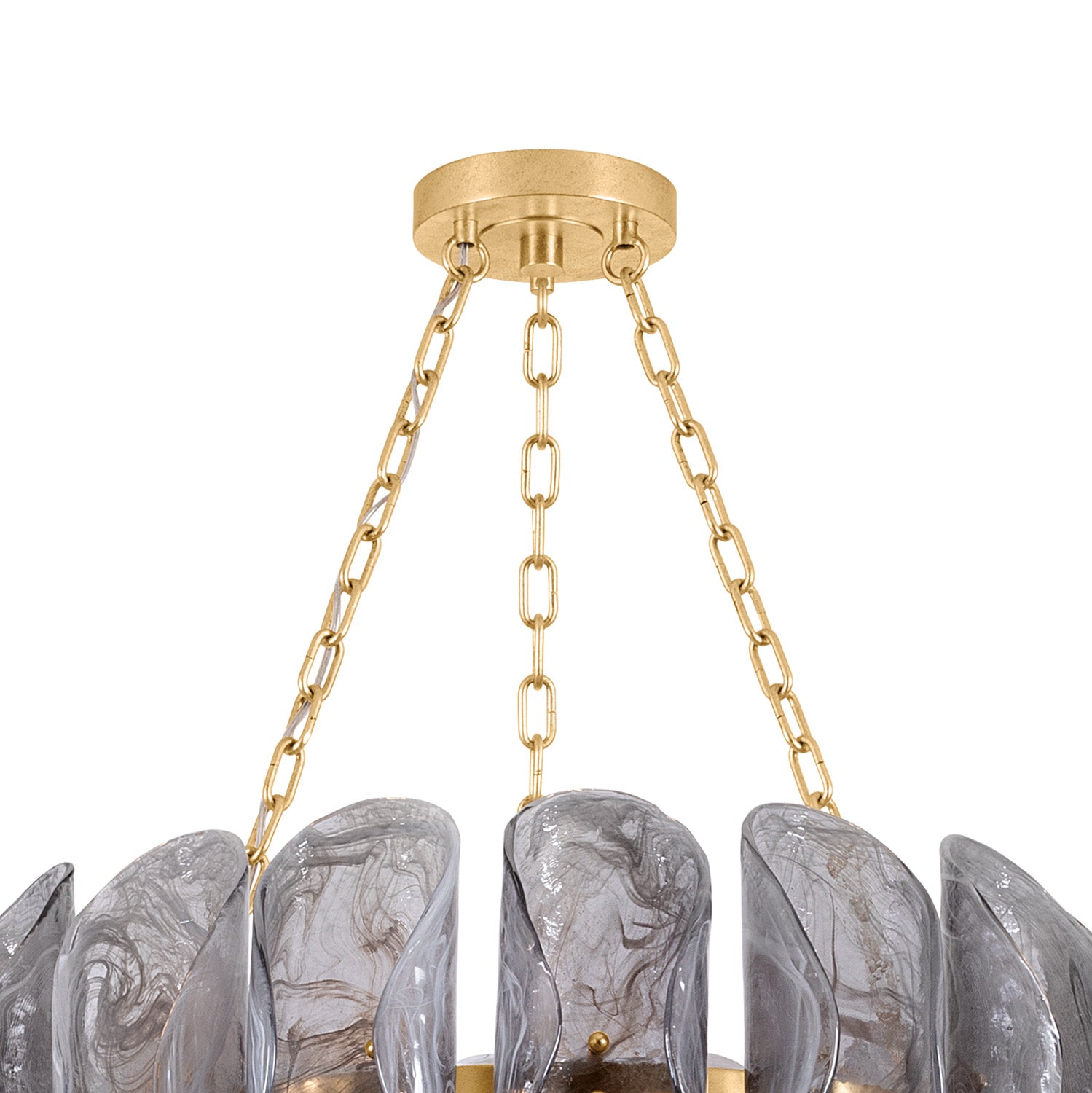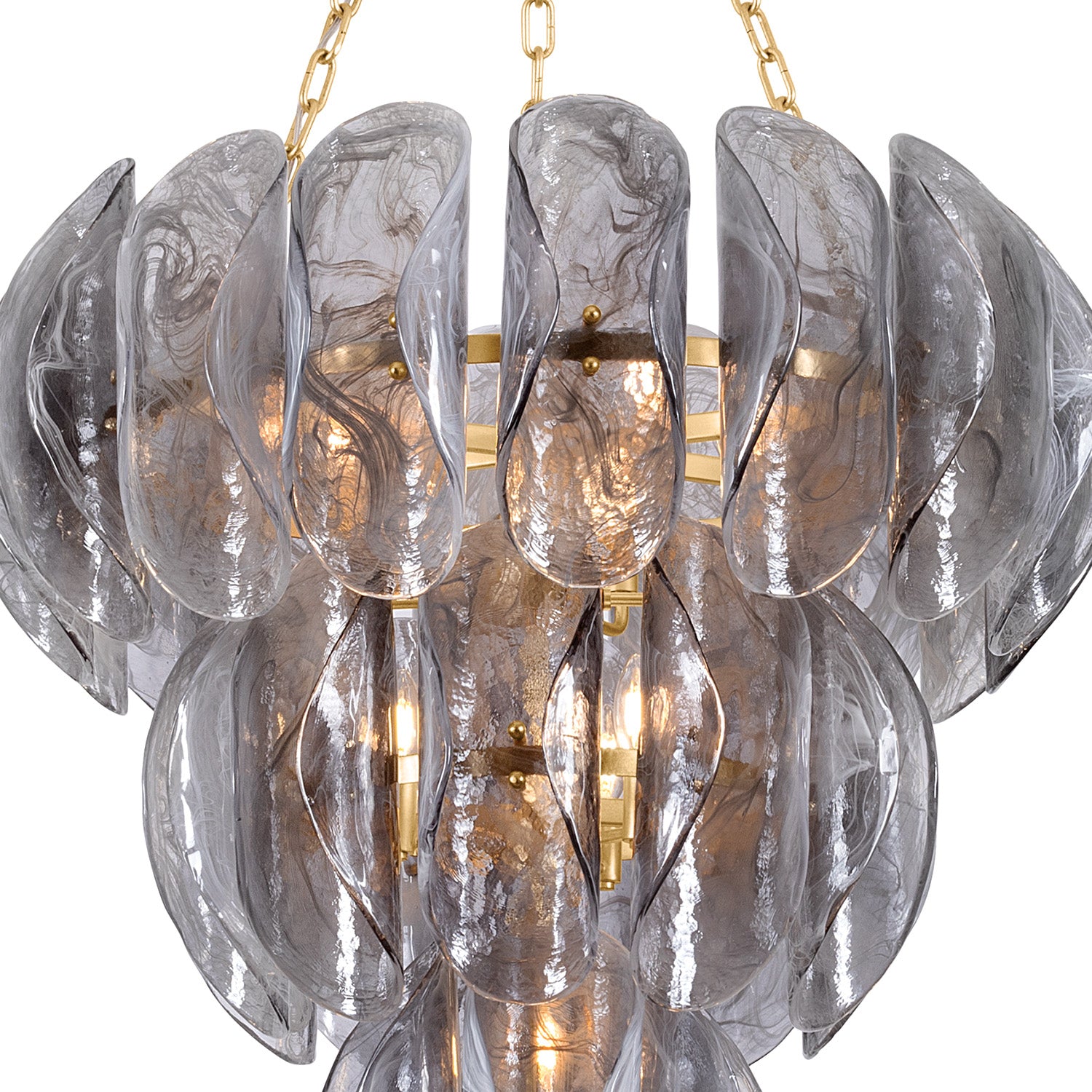The Vivian Chandelier 33" is a luxury statement light that makes a breathtaking impression, defined by pieces of hand blown smoke glass resembling leaves curling as they fall. The multi-layered design creates a dynamic, dimensional structure around the light sources. This luxury statement chandelier is thoughtfully scaled to provide a rich, warm, multi-directional glow, making it an ideal centerpiece for a large living room or grand entryway. With its UL damp rating, this design is perfect for adding a refined, artisanal touch and warm light to sophisticated interiors. The opulent Gold Leaf finish and rich, textured glass deliver enduring luxury and a perfect blend of elegance and simplicity.