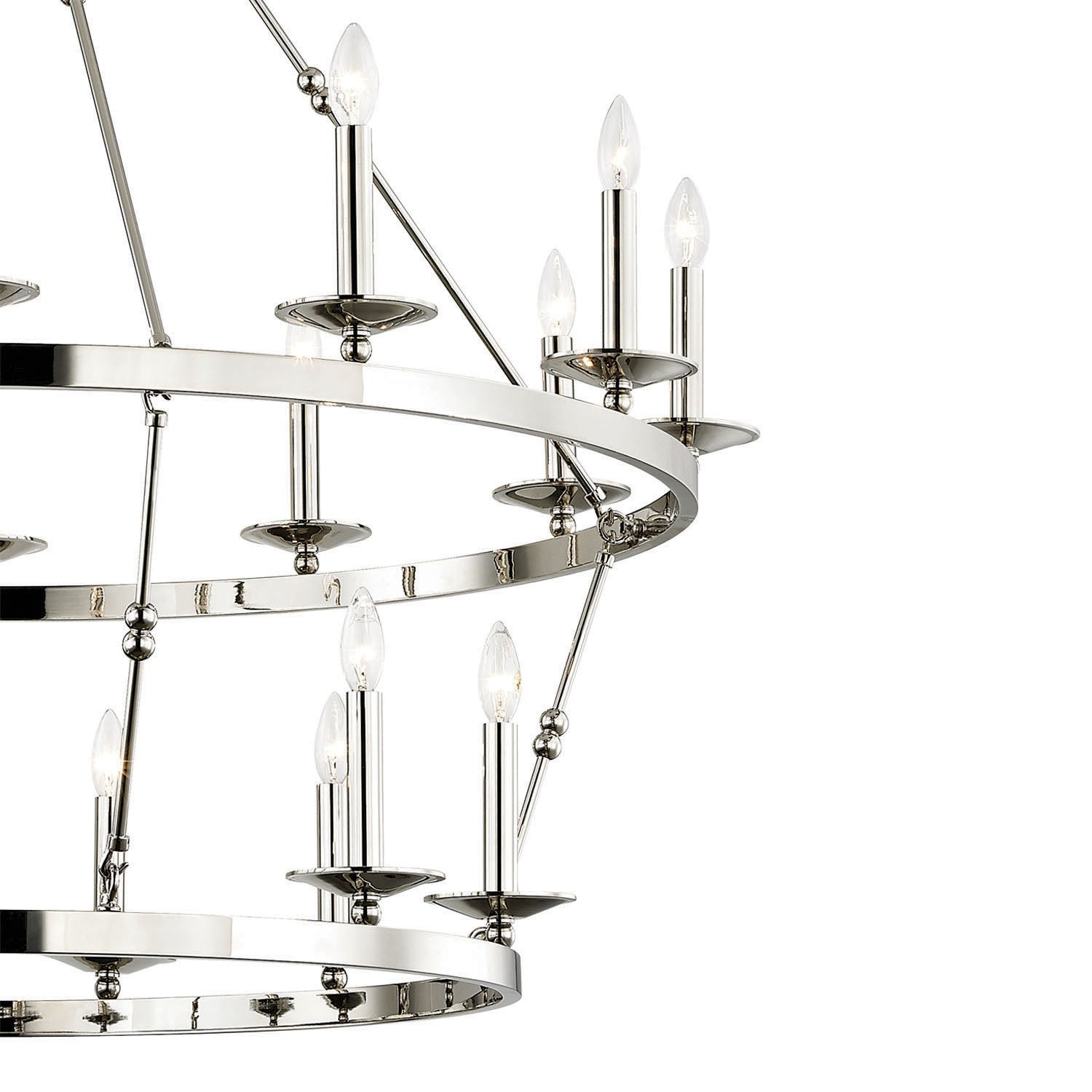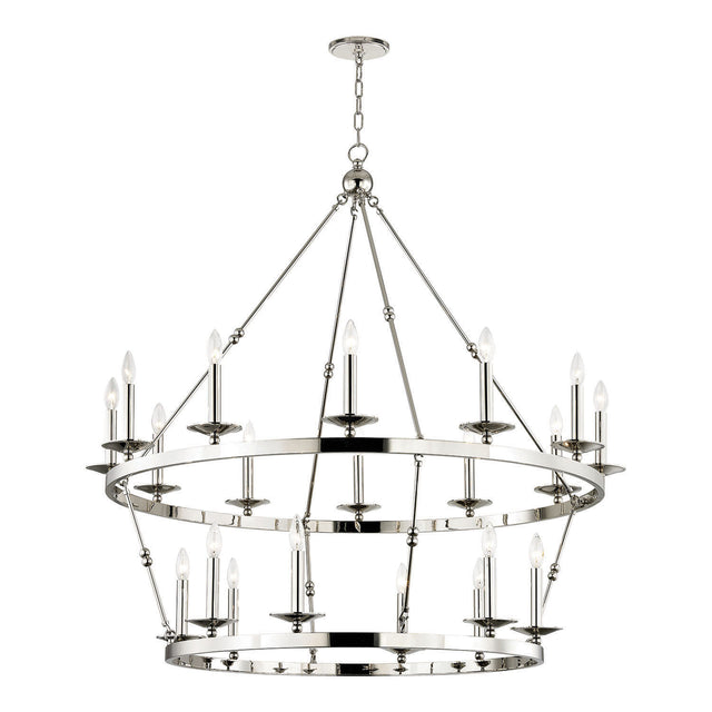 The William Two-Tier Ring Chandelier is a classic statement Ring Chandelier that makes a sophisticated impression with its grand, layered design and expansive scale. The fixture features two sweeping rings mounted vertically, providing 20 exposed candelabra lights that deliver comprehensive, multi-tiered illumination. This two-tier Ring Chandelier is thoughtfully designed as an impressive centerpiece for a grand living space or high-ceiling entryway. With its UL damp rating, it offers both functional beauty and versatile appeal. The brilliant Polished Nickel finish enhances the fixture's clean silhouette, providing a sleek, reflective sheen that adds modern sophistication. This striking collection delivers enduring style and a perfect blend of elegance and simplicity.