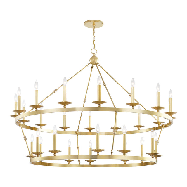 The William Two-Tier Ring Chandelier is a classic statement Ring Chandelier that makes a sophisticated impression with its grand, layered design and commanding scale. The fixture features two sweeping rings mounted vertically, providing 28 exposed candelabra lights that deliver comprehensive, multi-tiered illumination. This extra large two-tier Ring Chandelier is thoughtfully designed as an impressive centerpiece for a grand ballroom or massive two-story foyer. With its UL damp rating, it offers both functional beauty and versatile appeal. The rich Aged Brass finish enhances the fixture's clean silhouette, delivering enduring style and a perfect blend of elegance and simplicity.