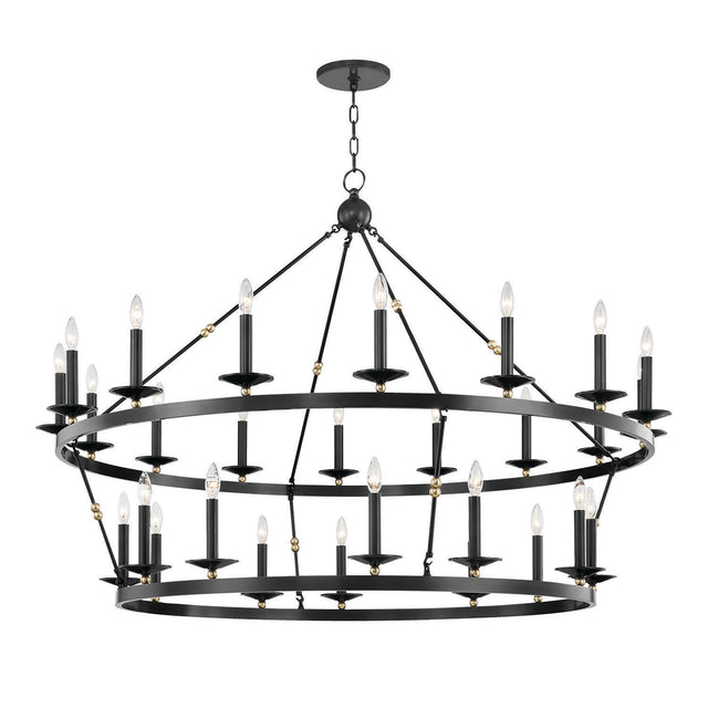 The William Two-Tier Ring Chandelier is a classic statement Ring Chandelier that makes a sophisticated impression with its grand, layered design and commanding scale. The fixture features two sweeping rings mounted vertically, providing 28 exposed candelabra lights that deliver comprehensive, multi-tiered illumination. This extra-large two-tier Ring Chandelier is thoughtfully designed as an impressive centerpiece for a grand ballroom or massive two-story foyer. With its UL damp rating, it offers both functional beauty and versatile appeal. The deep Old Bronze finish enhances the fixture's clean silhouette, providing a rich, dark contrast that adds depth and enduring elegance. This striking collection delivers enduring style and a perfect blend of elegance and simplicity.