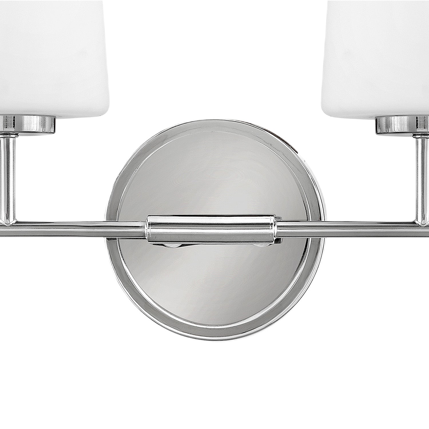 • Bell-shaped milk glass shades provide a soft, diffused glow, beautifully contrasted by the chrome finish