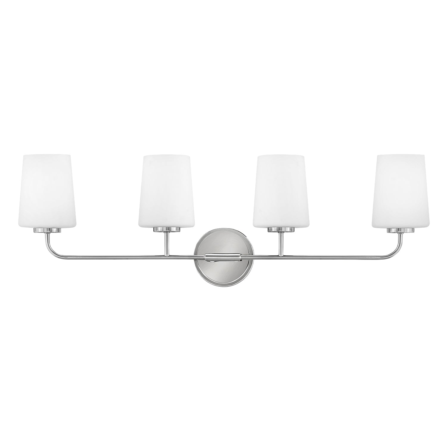 • Four-light vanity fixture featuring clean, horizontal lines and milk glass shades