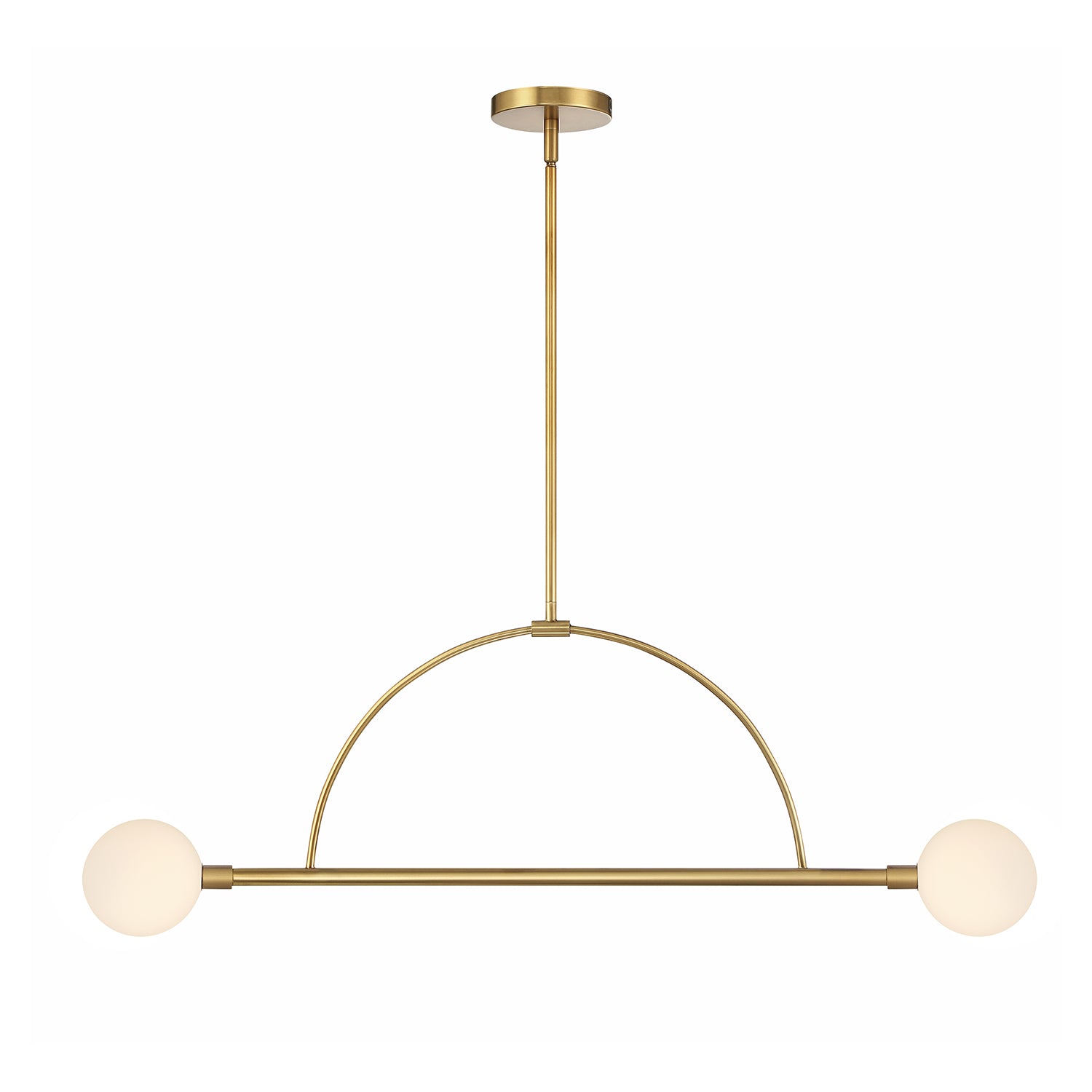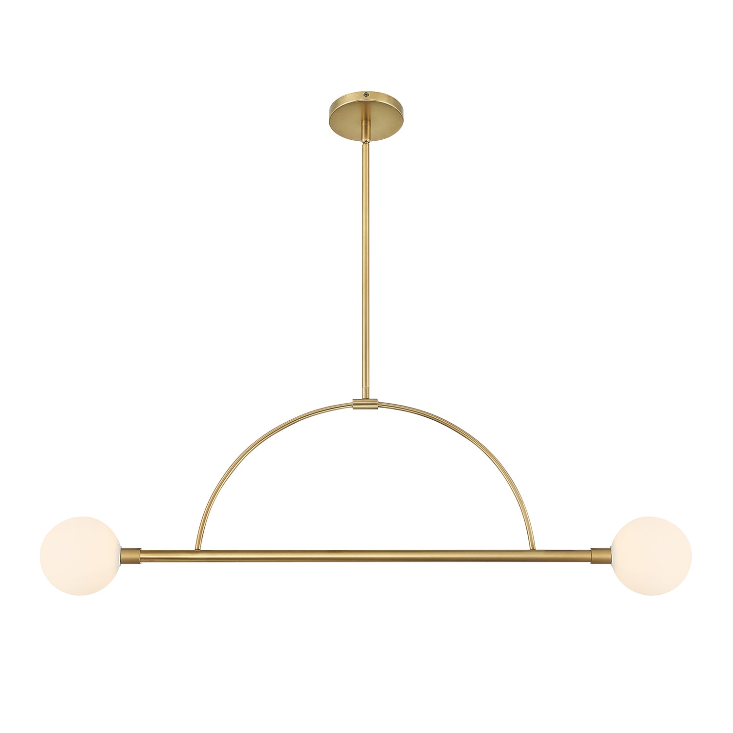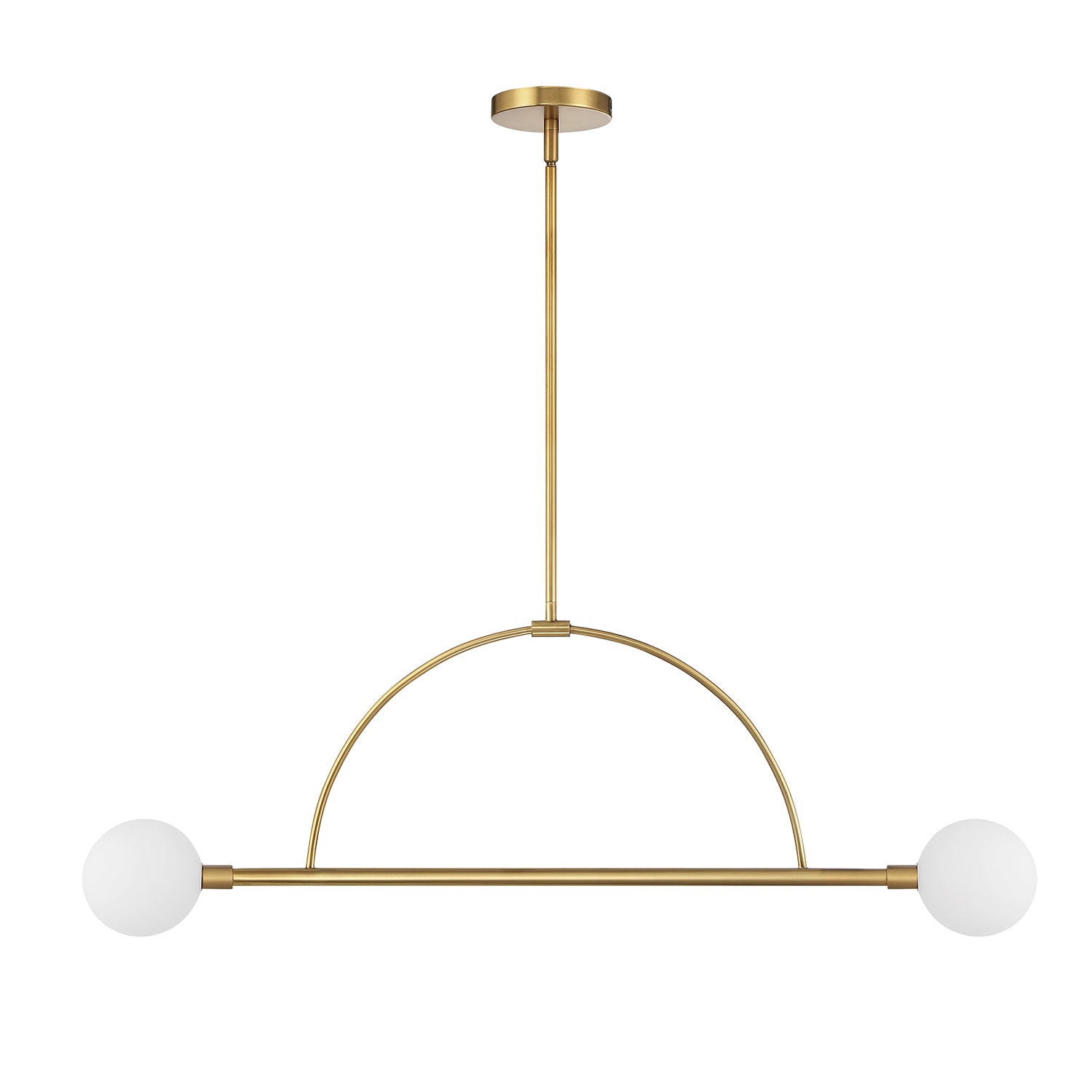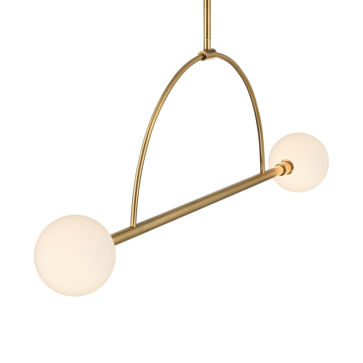 Inspired by the sun setting over the ocean, the Milo 2 Globe Linear Arc LED Pendant presents a sophisticated design through an effortless geometric silhouette. Designed by award-winning industrial designer Steve Cozzolino, in collaboration with Lights.com, thoughtful mid-century modern styling is at the forefront of this iconic pendant. Cozzolino created the Milo with deep consideration of the forms of the fixture and how they enhance the overall harmony and flow of the design. The dual opal etched glass globes are the perfect counterbalance to the gracefully arched Aged Brass frame. Balancing beauty with utility, the Milo uses high-lumen, dimmable LED bulbs that cast a warm white glow and create an inviting atmosphere. True to its mid-century modern aesthetic, the Milo is an ideal statement piece; place over a dining table or desk, or as a single stand-out pendant over a kitchen island. The Milo Pendant is also available in an matte black finish.